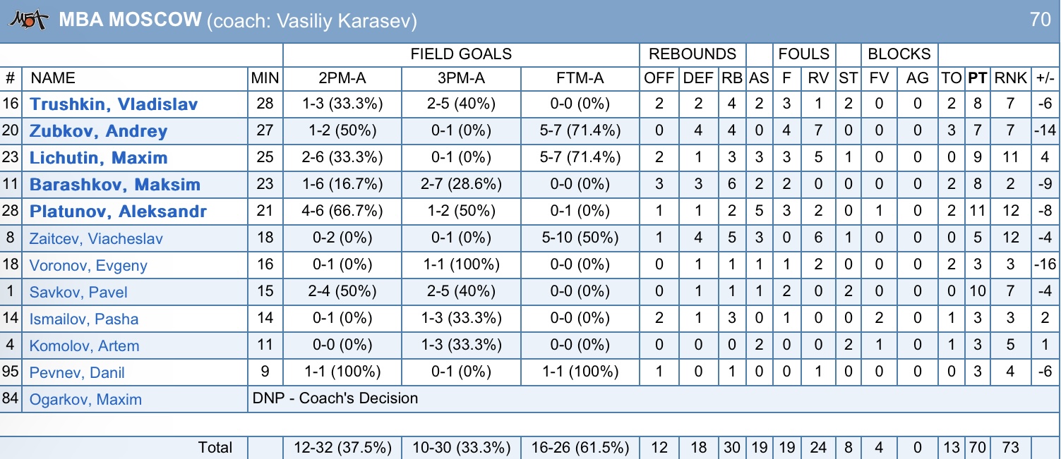 Кто мог себе представить, что третьей и четвертой командой будут коллективы Евгения Пашутина и Василия Карасева? Такова реальность. Пермяки набрали шикарную форму и одержали 5 побед подряд. «Парма» имеет самую результативную стартовую пятерку – 59 очков в среднем за игру. Москвичи же имеют самую результативную скамейку – 42,6 очка. МБА показывала приятную игру на старте чемпионата и проиграла всего одну игру.