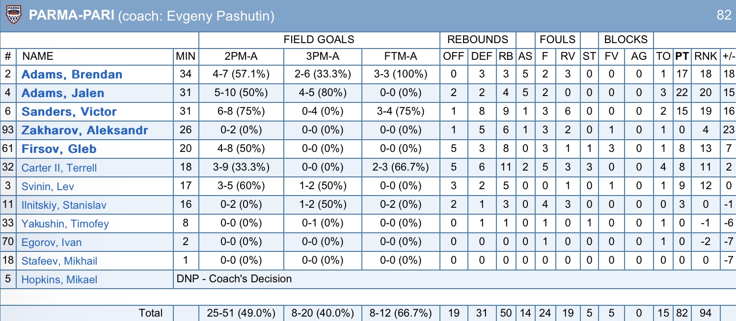 «БЕТСИТИ ПАРМА» показывает яркую игру и продлевает победную серию. В данной игре подопечные Евгения Пашутина установили рекорд сезона по подборам – 52. Из них 19 были в нападении, что позволило пермякам выиграть. Очень приятно смотреть за их игрой, и хочется, чтобы победная серия продолжалась как можно дольше. Кстати, Микел Хопкинс был в заявке на игру и был замечен на скамейке. Надеюсь на скорый дебют центрового. Молодые Фирсов и Свинин порадовали сегодня болельщиков, которые полностью заполнили «Молот».
