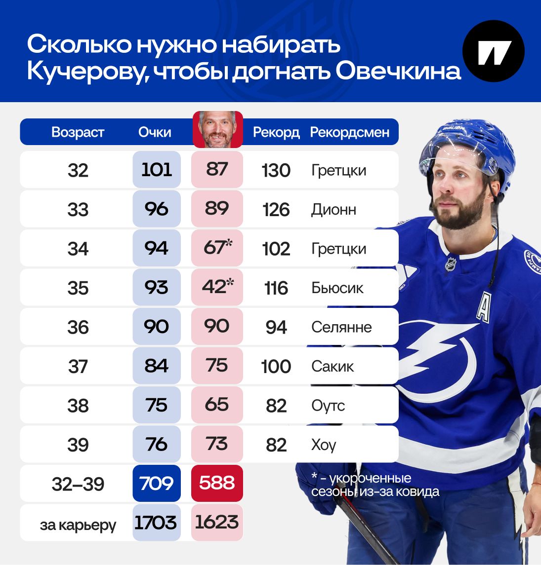 В-третьих, Кучеров добрался до тысячи быстрее Овечкина по затраченным играм, но не по возрасту. Александру было 31 год и без малого 4 месяца, Никите – на год больше. И это, по идее, означает, что Кучерову придется играть дольше или плюс-минус столько же. А ведь Овечкину уже 40, и он продолжает! И не забываем про отставание в 41 очко на отметке 32 года.