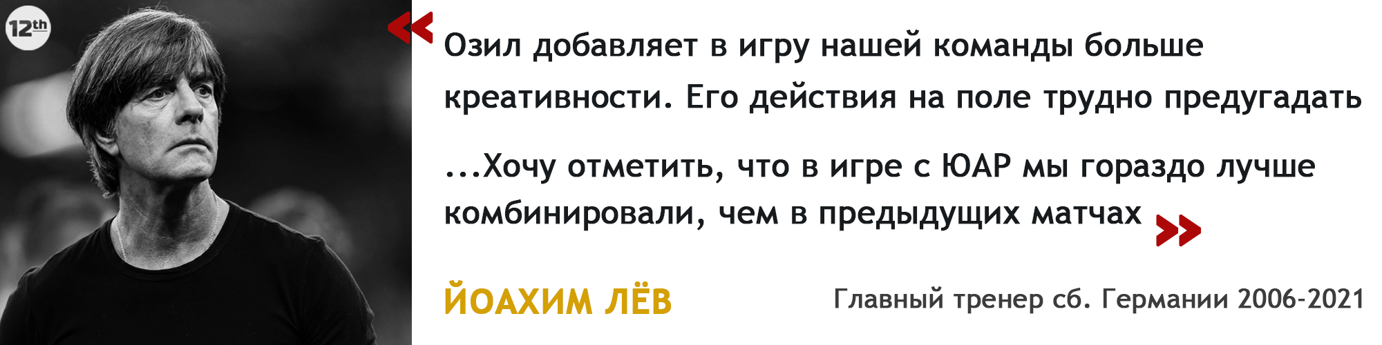 Для Озила стартовала первая попытка завоевания долгожданного для Германии трофея. На матчах ЧМ 2010 он был особенно заметен. Каждый раз получая мяч, Озил будто останавливал время, прежде чем отправить товарищей прочь со скоростью миллион миль в час. Игры проходили в его ритме, он диктовал темп, решал, как и где будет вскрыта оборона соперника.