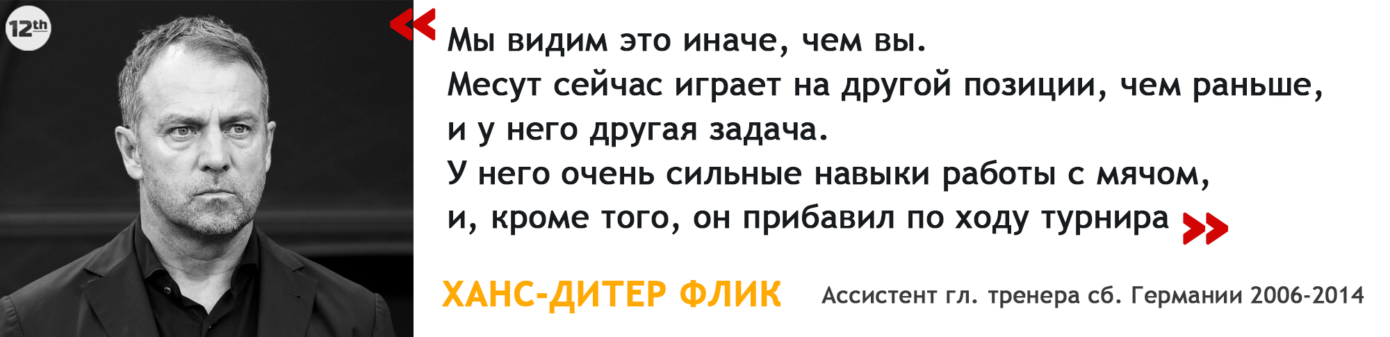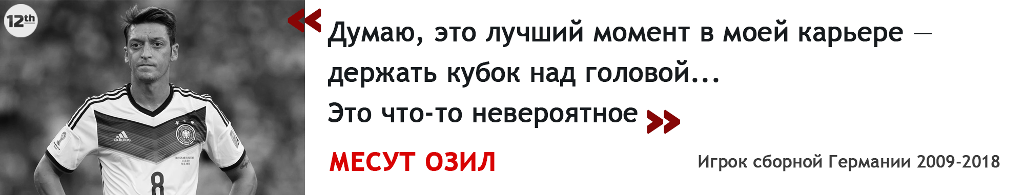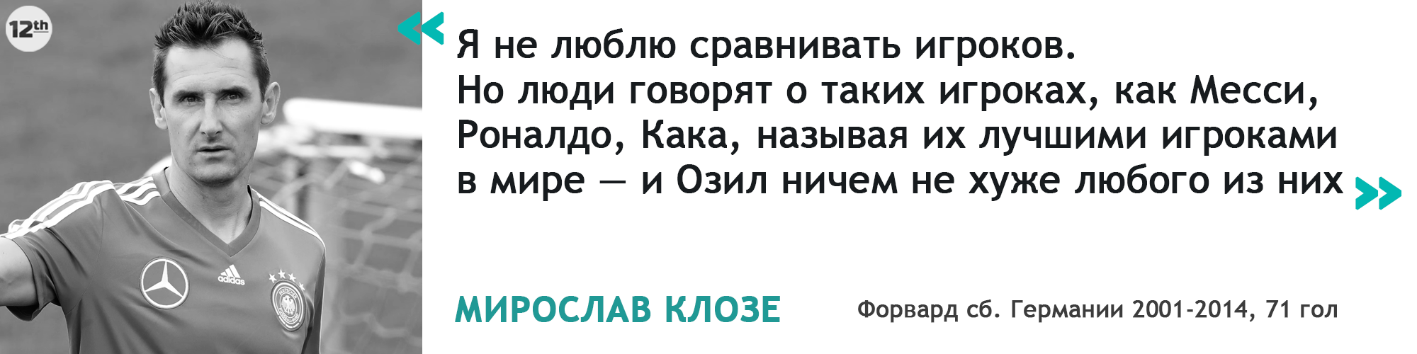 На протяжении каждого матча Месут был главным механизмом атаки. Тони Кроос был коробкой передач той сборной, Озил был его двигателем. Один выбирал скорость и темп, второй это контролировал и наделял остальных атакующих. Их важность особенно отражалась в двух матчах (1/8 финала против Алжира и финал с Аргентиной), они отыграли основное время и весь овертайм.