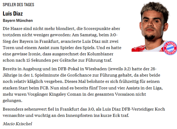 До начала матча шестого тура с «Айнтрахтом» во Франкфурте казалось, что именно «орлы» смогут доставить проблемы мюнхенцам. Однако хозяева продержались секунд 15 – Диас открыл счет буквально сразу после стартового свистка. Кейн удвоил преимущество на 27-й минуте и совершенно деморализованный «Айнтрахт», так и не сумел вернуться в игру. На 84-й Диас забил третий и последний гол в том матче.