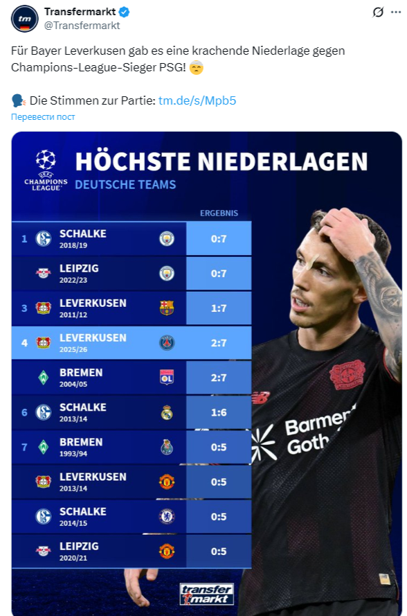 Для гостей из Парижа в Леверкузене в лигочемпионский вечер «Байер» распахнул все двери и окна. Матч в целом получился феерическим. Пачо открыл счет уже на седьмой минуте, потом за игру рукой Гримальдо был назначен пенальти, впрочем, Шевалье его не реализовал. Дальше в течение пяти минут рефери сократил составы: удалил Андриха у хозяев и Забарного у гостей. На перерыв команды ушли со счетом 1:4, после перерыва было забито еще четыре мяча. Невероятные 2:7, однако, ставят под угрозу продолжение участия леверкузенцев в турнире весной – 30 место в общей таблице после трех туров и в целом сложности с набором очков в элитном еврокубке.