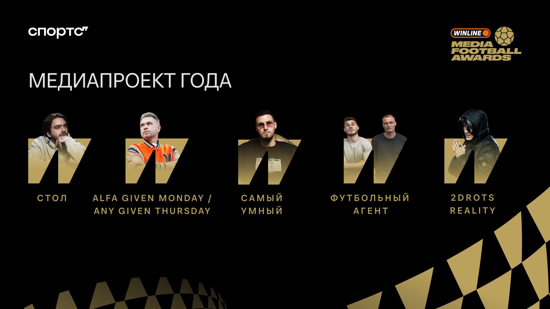 На приз претендуют: «Стол», Alfa Given Monday и Any Given Thursday, «Самый умный» Алексея Гасилина, «Футбольный агент» от Макея и Кента и 2Drots Reality.