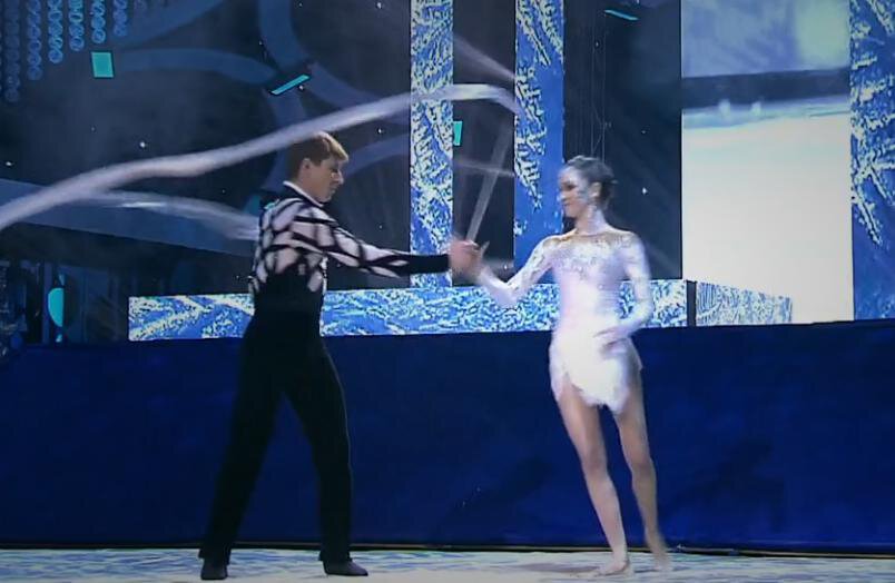 Попробовала наша лучшая художественная гимнастка Мария Борисова – она выступает на соревнованиях с обручем с программой, которая поставлена по мотивам олимпийской «Зимы» Ягудина из сезона-2001/02.