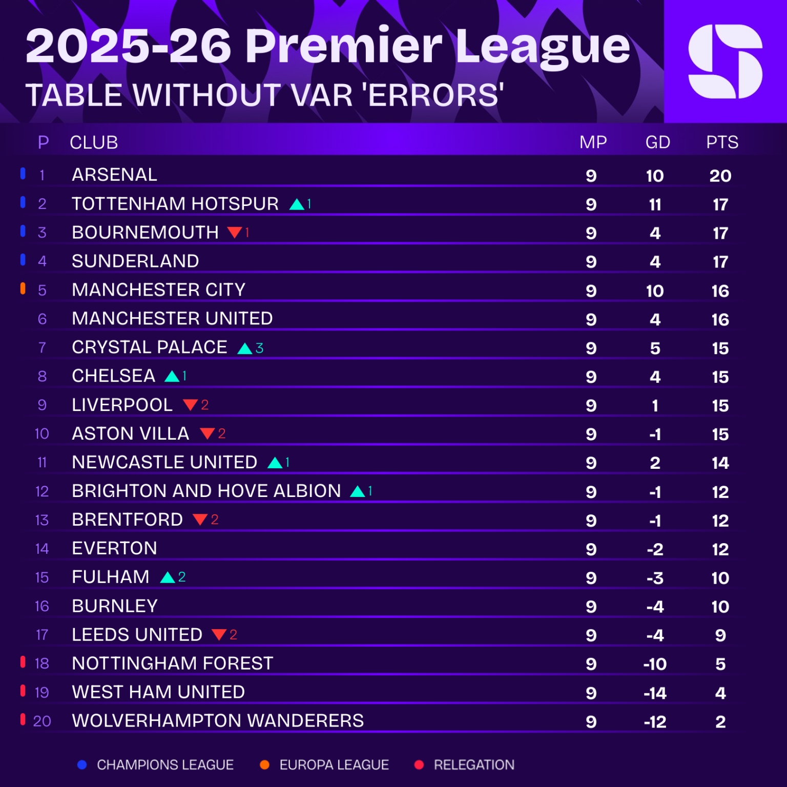 Портал Squawka, специализирующийся на футбольной аналитике и статистике, предположил, как бы выглядела турнирная таблица АПЛ после девяти туров нового сезона, если бы VAR не допустил ни одной ошибки.
