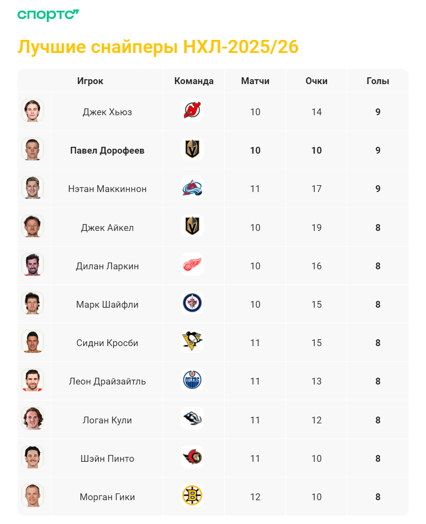 Всего у Дорофеева теперь девять шайб. Он делит первую строчку в топе снайперов с Нэтаном Маккинноном и Джеком Хьюзом.