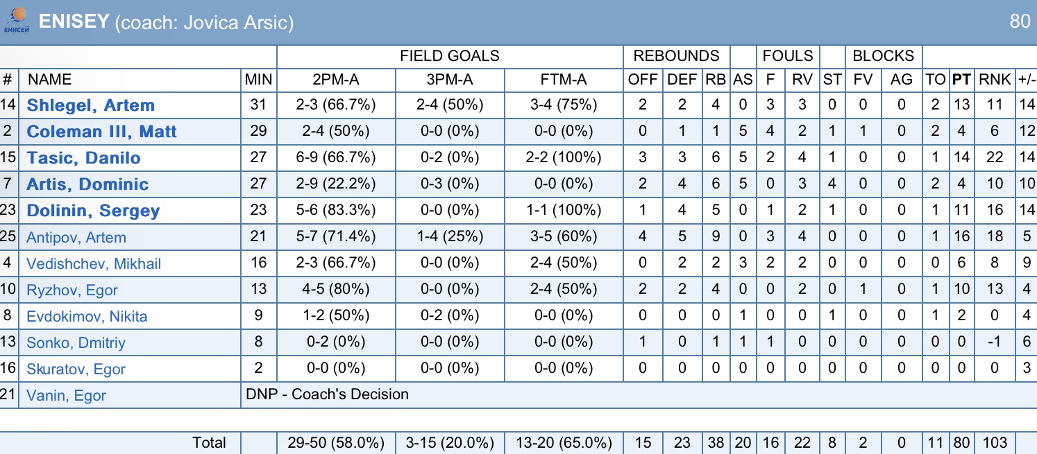 «Енисей» наконец-то одержал победу. Красноярцев не сломала серия неудач, и они продолжили показывать свою игру. В этой встрече грамотно давили на «больные точки» соперника. Тасич однозначно удачное подписание. Системообразующий игрок, который делает партнеров лучше. Проблема реализации дальних бросков остается нерешенной. Против нижегородцев к тому же не забили броски с линии. Показали хорошую игру и одержали долгожданную победу, но есть над чем работать. Стоит отметить, что в составе «Енисея» сразу 5 игроков набрали 10 и более очков.