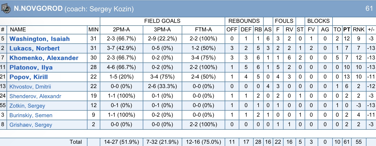 Безусловно, нижегородцы были не в полном составе. Большую роль сыграло отсутствие «больших». Но ощущение, что и с ними на паркете был бы тот же результат. Подопечные Сергея Козина не показали ничего интересного в атаке. Наверное, можно уже говорить, что селекция в этом году если не провалилась, то близка к этому. Хоть что-то показывает только Вашингтон, но он тоже нестабилен. Лукач за 6 игр имеет 0 из 17 из-за дуги. Костяк из российских игроков неплох, но это все хорошие ролевики. Лидера на площадке нет. Даже интересно, сможет ли что-то придумать Козин с этим составом. К сожалению, пока что «Нижний» – одна из худших команд чемпионата.