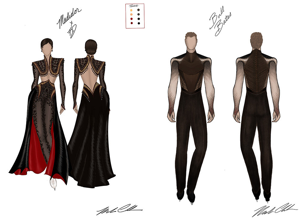 В обоих костюмах много технических элементов, которые потребовали серьезных исследований и многочисленных примерок. Мы даже создали несколько прототипов юбки-плаща Мэдисон, чтобы она могла протестировать его на льду и убедиться, что он безопасен, удобен в движении и идеально соответствует хореографии программы».