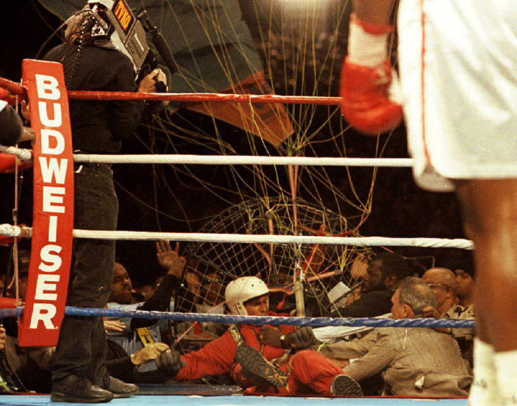 Холифилд вообще думал сбежать, когда увидел парашютиста – вспомнилось покушение на известную теннисистку Монику Селеш (об этом рассказывали здесь): «Не знал, что он сделает – нападет на меня или на Боу, но я попытался сбежать. Боялся, что у него мог быть пистолет или бомба».