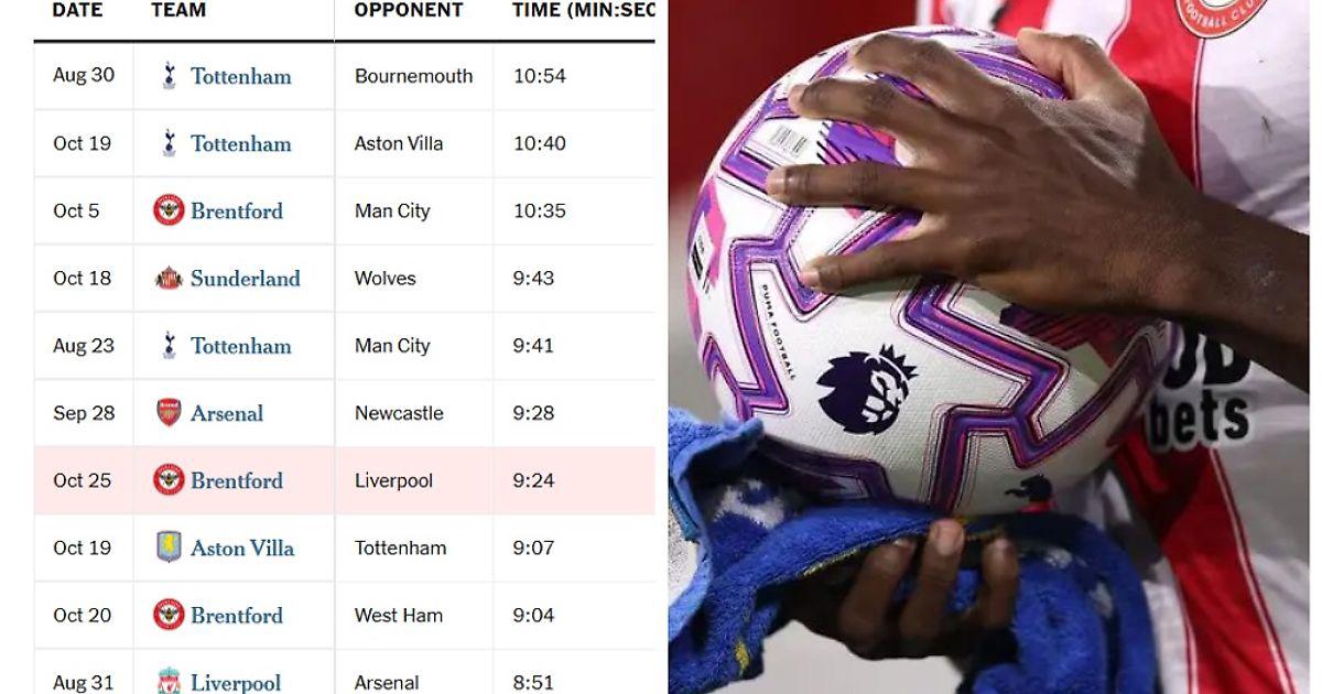 Кроме этого, The Athletic показал матчи, в которых дольше всего тратили время на вброс мяча из-за боковой.