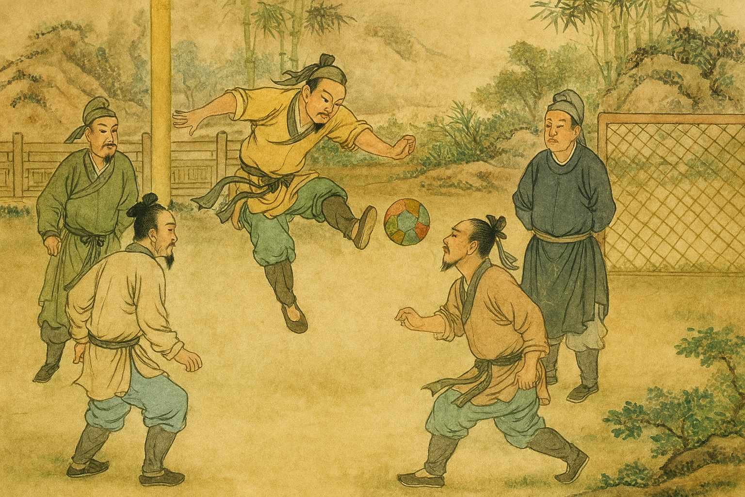 - Китай (III век до н.э.) — игра “цюцзюй” Игроки пытались забить набитый перьями мяч в сетку без помощи рук. Игра была частью военной подготовки и считалась полезной для укрепления боевого духа.