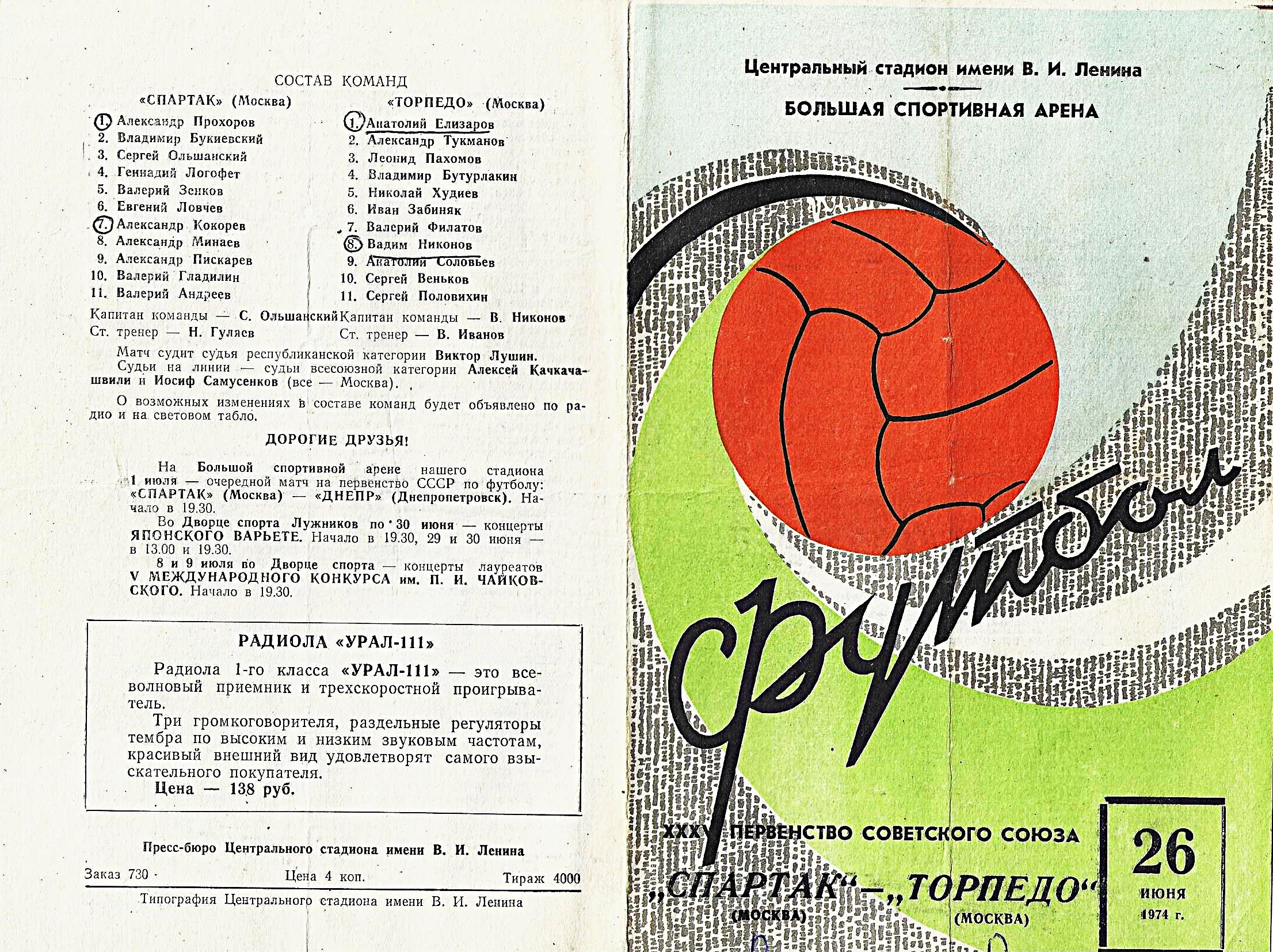 Спартак (Москва) - Торпедо (Москва). 26 июня 1974 года / Первенство Советского Союза