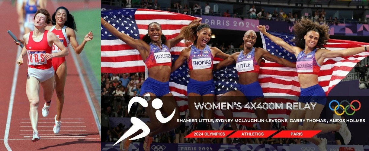 А вот здесь наличие мировой рекордсменки в лице Флоренс Гриффит-Джойнер не позволило старшему поколению обойти молодежь. Видимо с годами американки все-таки научились правильно передавать палочку и не забегать на чужую дорожку.
