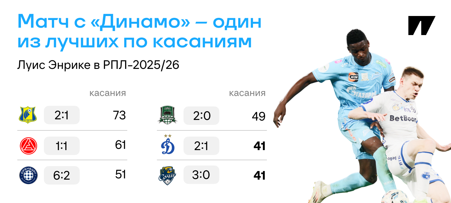 Энрике против «Динамо» 41 раз встречался с мячом – еще ни разу центральный нападающий «Зенита»-2025/26 не был настолько вовлечен во владение.