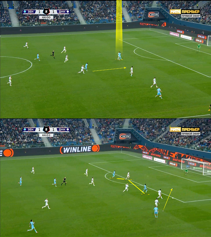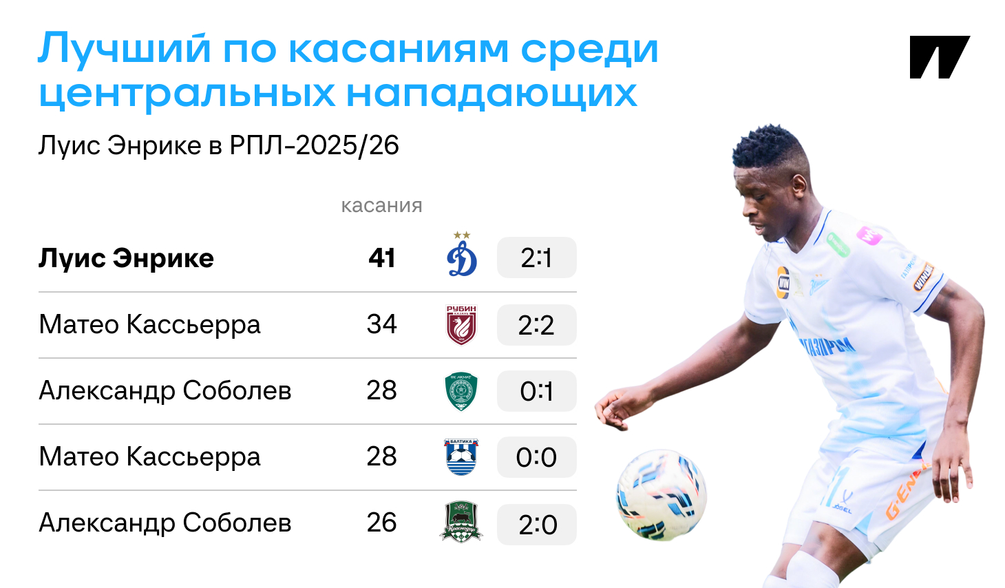 Энрике играл центрального нападающего против «Динамо». Лучший дриблер «Зенита» объединяет концепцию Семака рывков за спину и забросов: он быстрый, топово работает с мячом, хорош в борьбе и добивает дуэли обводками, скоростью и передачами. У Энрике солидная статистика единоборств, несмотря на пропуск двух туров и ранние замены из-за плохой формы.