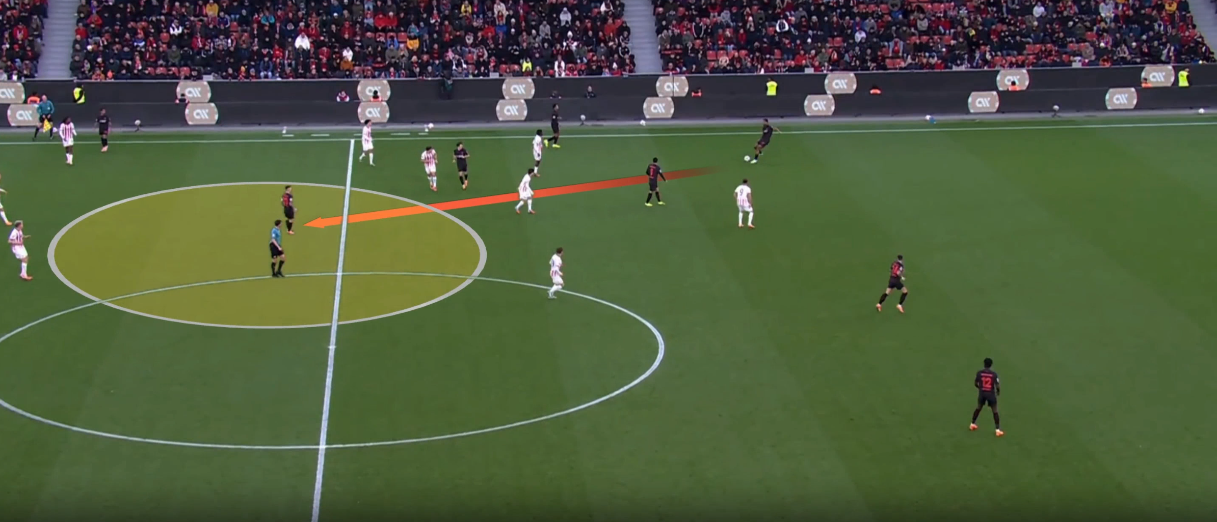 Сейчас в «Байере» тактически интересная динамика: Гримальдо по ходу атаки смещается в центр, а место на фланге занимает Эрнест Поку, левый инсайд в 3-4-2-1. Ему комфортно лететь в скоростной дриблинг из широкой позиции у боковой. Учитывая желание «Байера» сохранять тройку центральных защитников, учитывая пользу Гримальдо на мяче и специфику Поку – это хорошая идея тренера Юлманда. Хотя сильный соперник способен наказывать «Байер» в быстрых выпадах через эту зону.