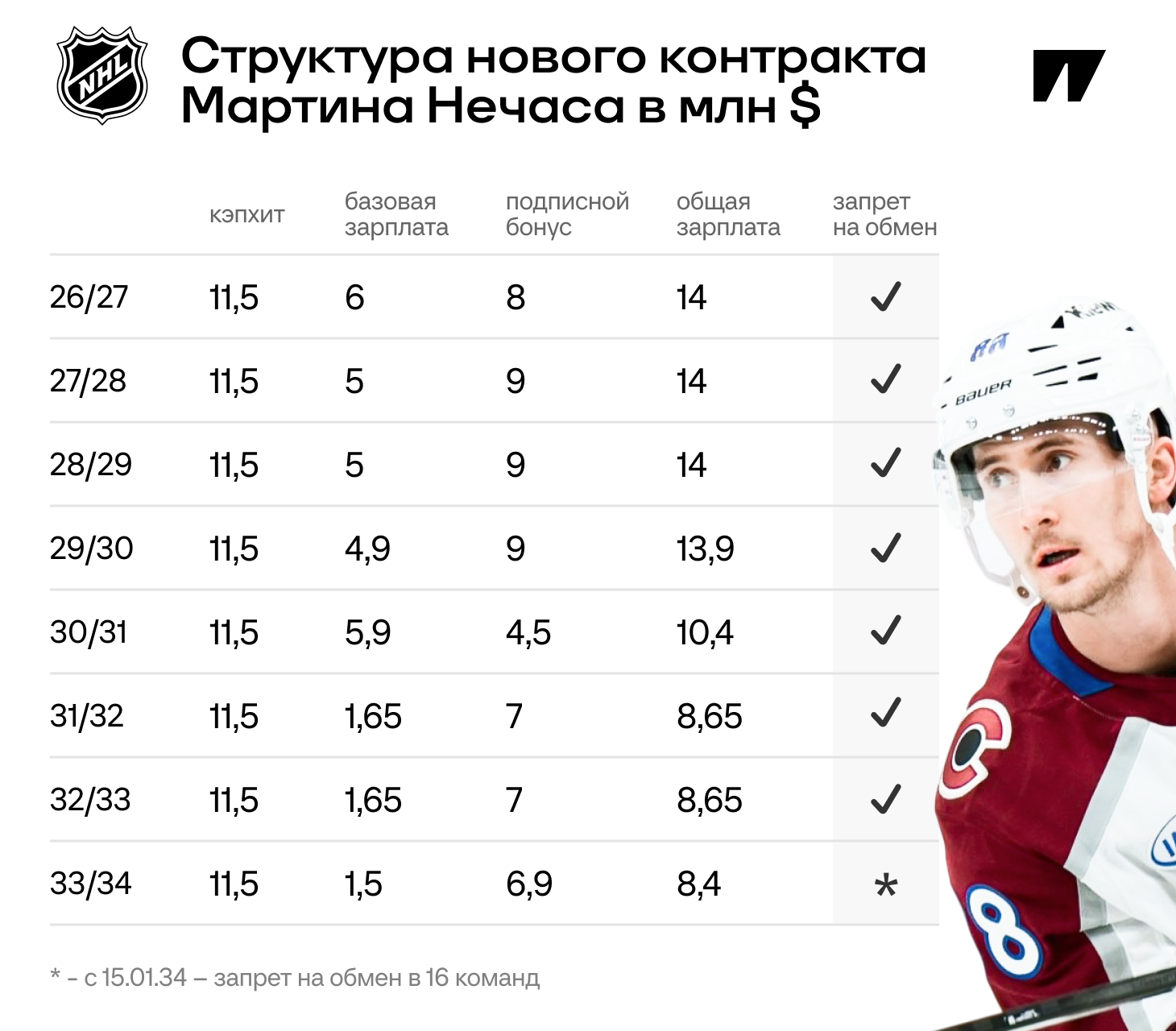 Накануне «Колорадо» объявил о продлении контракта с Мартином Нечасом – 11,5 млн на 8 лет – и убрал очередную крупную фигуру с рынка свободных агентов-2026. Судя по структуре соглашения, «Эвеланш» практически безгранично верят в чеха: большой подписной бонус и запрет на перемещение до января 2034-го, когда будет идти последний год контракта (если что, сможет сменить клуб на дедлайне и пойти за кубком):