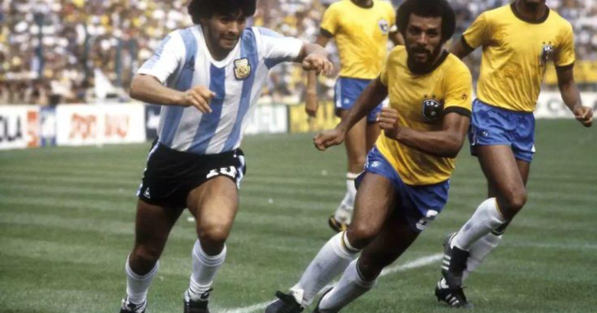 1982г. БРАЗИЛИЯ - АРГЕНТИНА. 21-летний МАРАДОНА в игре против Бразилии...(бразильцы, слева-напр: СОКРАТЕС, ЖУНИОР, Луизиньо).