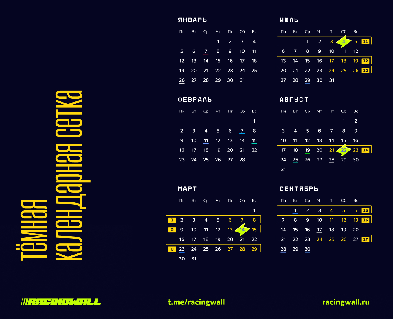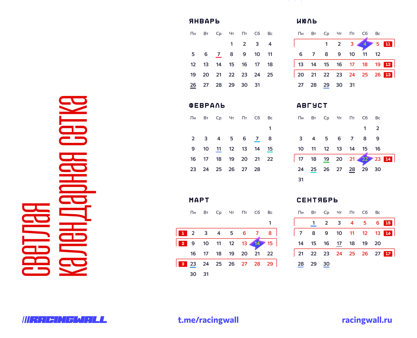 Я выбрал выделение недели проведения Гран-При, основной критерий — чтобы выделение было контрастным и различимо на расстоянии. Но этот момент дополнительно буду проверять на первых пробных печатных экземплярах. Так как на экране это может выглядеть хорошо, а вот в реальном размере и печати могут возникнуть непредвиденные сюрпризы.