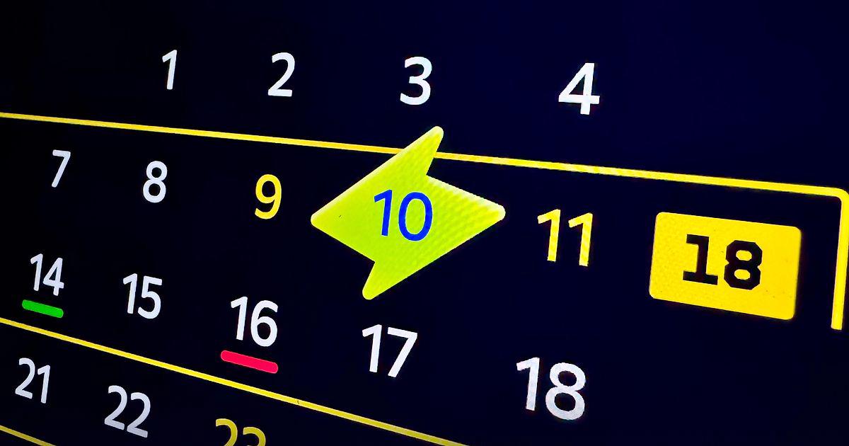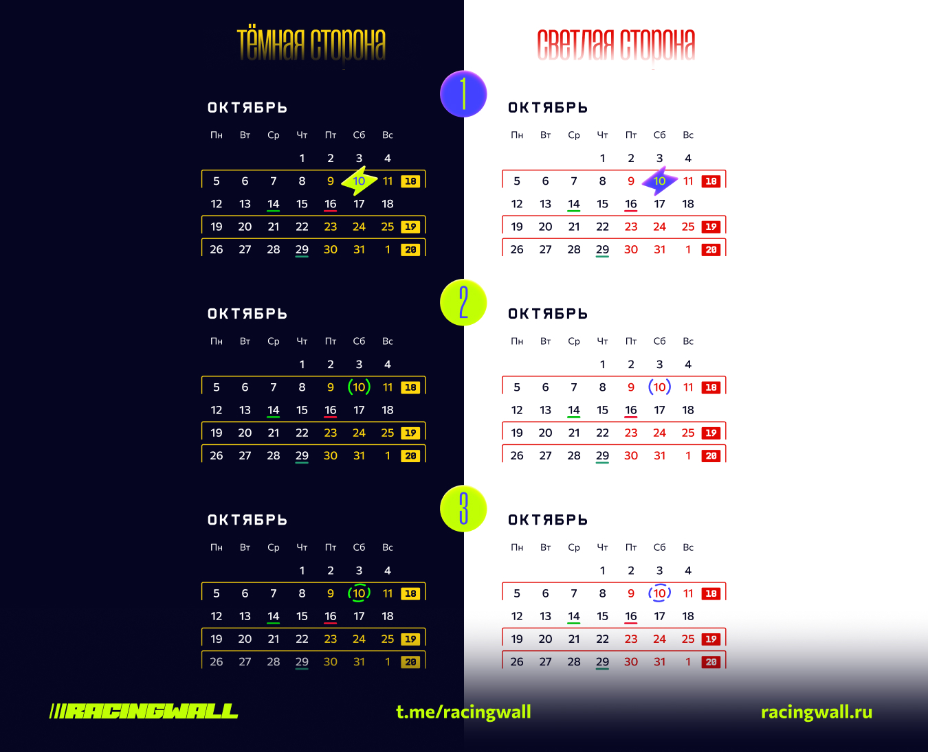 Следующая задача для календаря — это выделить недели с weekend grand prix. Для этой задачи нужно найти подходящий контраст, чтобы обеспечить быстрое считывание (сканирование) календаря. Дополнительно к выделению недели и самого weekend нам нужен вспомогательный визуальный «якорь» с номером этапа Гран-При. Никаких государственных праздников и выходных в календаре отмечать не планирую.