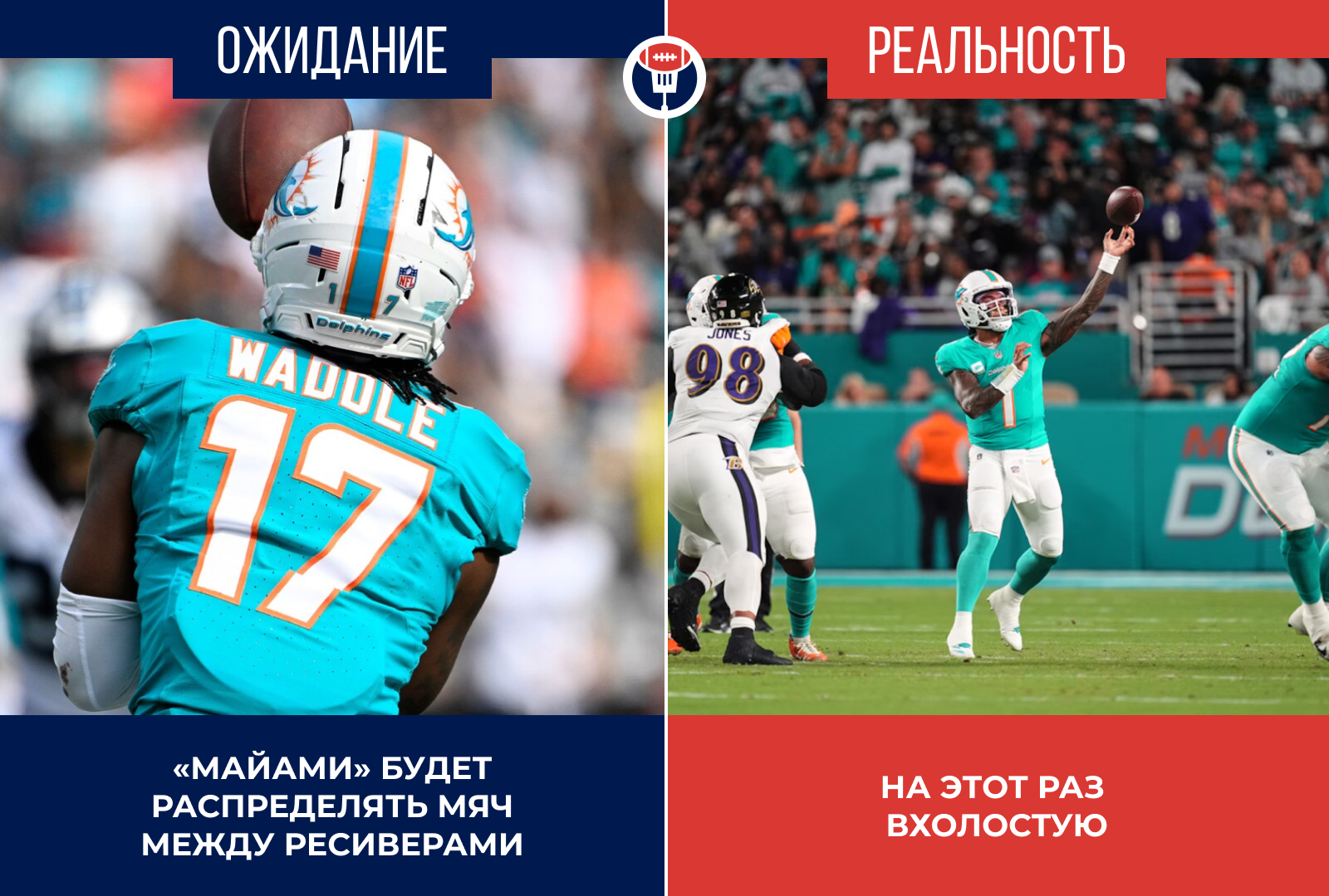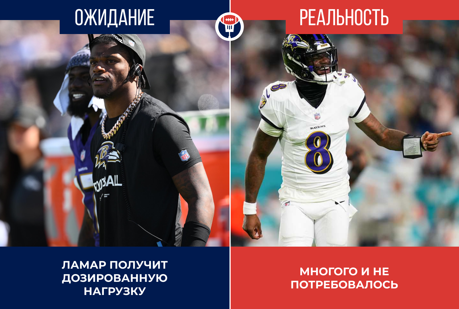 Ламар действительно не так много пасовал (18 точных передач за 23 попытки), хотя по его меркам это приличные цифры. И не так часто бегал (5 выносов на 14 ярдов). Главное же – он не получал опасных ударов и какого-либо намека на рецидив недавно зажившей задней. Для «Рейвенс» игра вообще сложилась по идеальному сценарию: без пропущенных тачдаунов, без травм, со знаковыми 100+ ярдами на выносе и отличным взаимодействием квотербека с тайт-эндами. Забавно, что уроженец Южной Флориды за карьеру в НФЛ провел 13 матчей с 4+ пасовыми тачдаунами, и три из них – против «Долфинс».