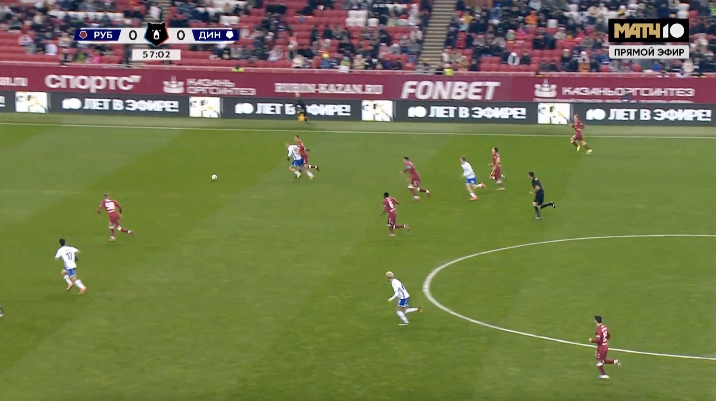 А потом за фол на Константине Тюкавине – форвард «Динамо» убегал бы на пространство, но Нижегородов помешал ему сзади, опаздывал.