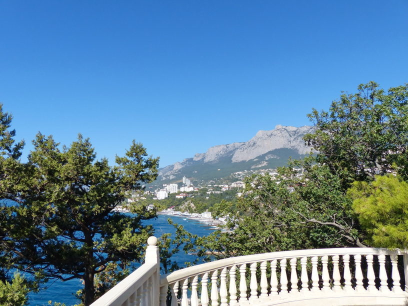 На верхней террасе обычно стоят люди с камерами и просто молчат — пейзаж говорит сам за себя. Для тех, кто интересуется архитектурой и выбирает, куда сходить в Ялте, это место обязательно к посещению.