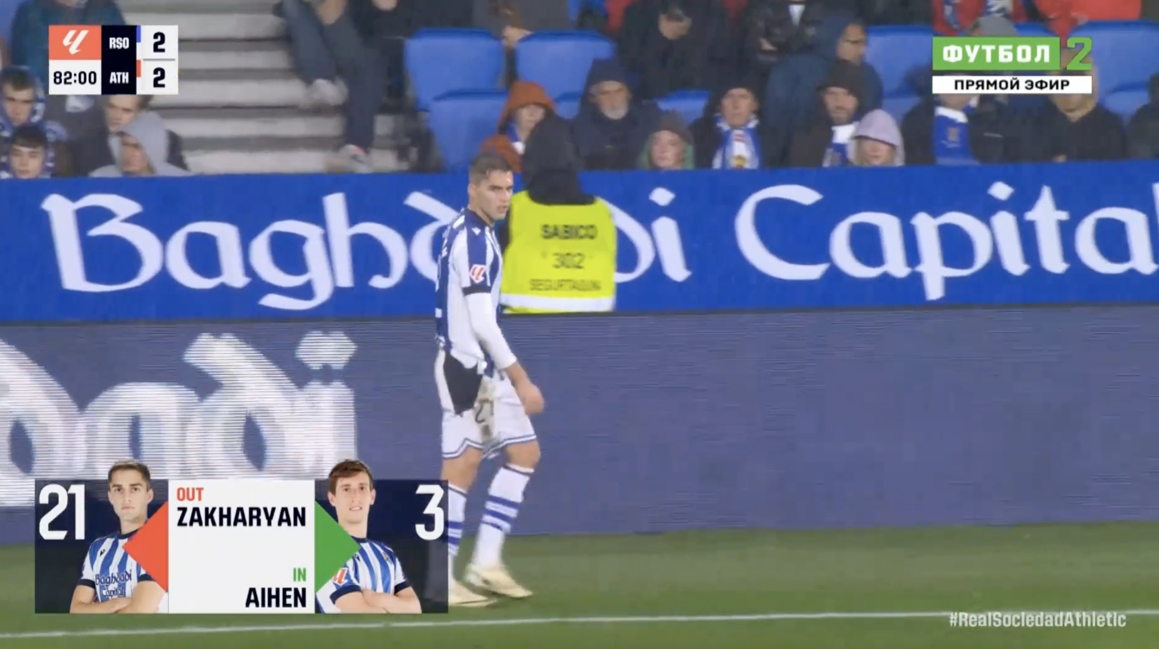 Арсена выпустили на 41-й минуте. «Сосьедад» вел 1:0, тренер Серхио Франсиско убрал Андера Барренечеа, главного конкурента Захаряна на позиции левого вингера.