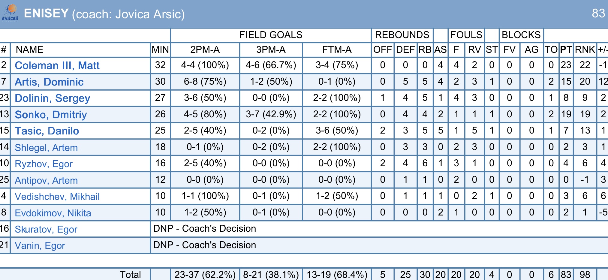 Мэтт Коулмэн провел лучший матч за «Енисей». У американца 23 очка (4 из 4 – двухочковые, 4 из 6 – трехочковые, 3 из 4 – штрафные) и 4 передачи без единой потери. Отличную игру так же показал Дмитрий Сонько. Он набрал 19 очков (4 из 5 – двухочковые, 3 из 7 – трехочковые, 2 из 2 – штрафные), 4 подбора, 2 передачи и 1 перехват, совершив 2 потери.