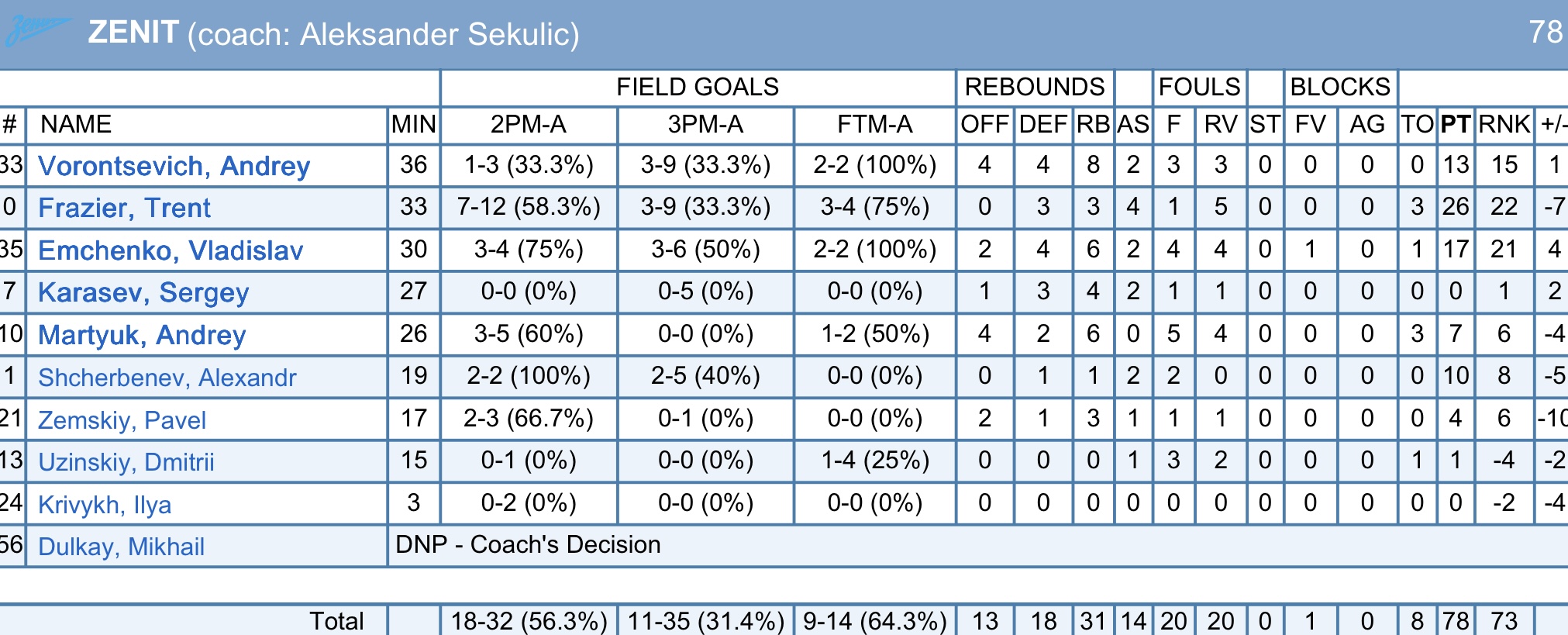«Зенит», напротив, испытывает трудности. В первой половине бросок не пошел у всех. Сергей Карасев так и не нашел его. В 3 четверти смогли вернуться, но ненадолго. Безусловно, тяжело играть с короткой скамейкой, но вряд ли это является оправданием для вице-чемпионов. Нужно уметь адаптироваться, но сегодня не получилось.