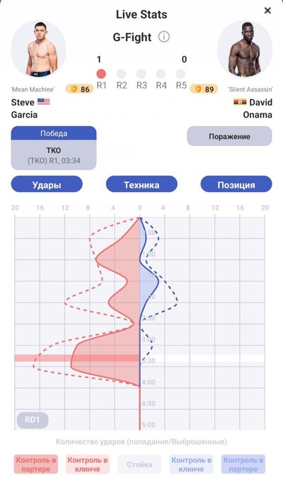 Мы с вами действительно увидели избиение. Гарсия выдал настоящий “спектакль”, разбив Онаму меньше чем за раунд. Экран “Динамика поединка” в приложении Stats Fight отлично показывает, насколько весомое преимущество было у американца: