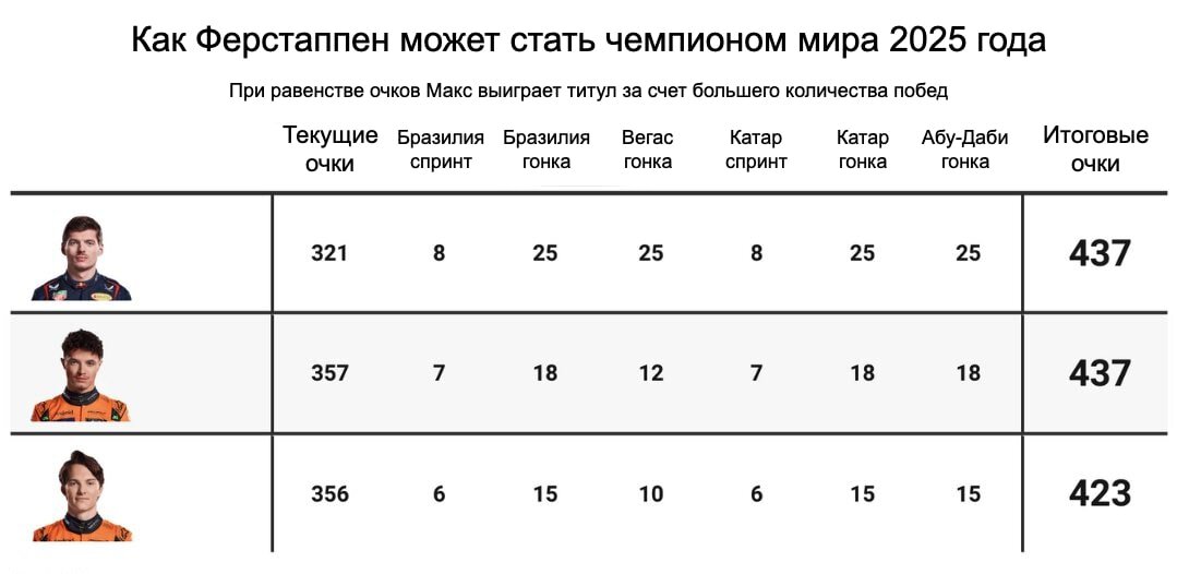 Более того, титул Макса без провалов «Макларена» теперь кажется пусть тяжелейшей, но уже не фантастической задачей. При собственных идеальных выступлениях нидерландца устроят вторые места Норриса во всех гонках и спринтах, кроме проблемного для британцев Вегаса.