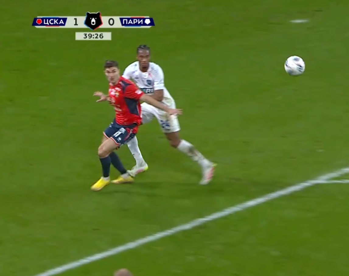 Сам же тур начался пятничной игрой ЦСКА - Пари НН, команд с разных полюсов турнирной таблицы. Но гости оказались верны идеологии своего тренера - в низкий блок не садились, ища шансы в атаке. Чем отличались в лучшую сторону от предыдущих гостей - Крыльев Советов, сидевших в «автобусе» с идеей найти шанс в быстрой атаке. И до второй половины первого тайма игра для хозяев складывалось не очень легко, на удар Облякова в перекладину на 6 минуте гости создали даже более явные шансы для Боселли и Александрова. Да и вообще к 38 минуте соотношение ожидаемых голов было xG 0,12-0,35 в пользу Пари НН. Но тут команду Шпилевского подвело качество игроков - в абсолютно безобидной ситуации их ЦЗ Фаринья не смог скоординироватся в борьбе с Мусаевым и попал ему по «ахиллу». Типичный «фол по неосторожности»: