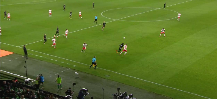 При этом есть окончание момента - перед голевым ударом игрок хозяев (№22) стоит прямо перед Гудиевым в явном «вне игры»