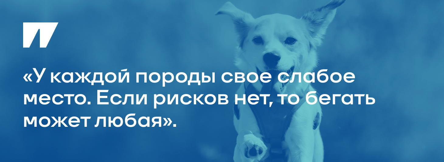 Лучше заранее узнать у ветеринара, к каким болезням предрасположена конкретная порода. У брахицефалов слабое место – дыхание, у крупных пород – суставы. Маленьким собакам не стоит бегать сверх сил, но и они могут получать удовольствие. Если у собаки предрасположенность к дисплазии, нужно особенно беречь тазобедренные суставы. Есть лишний вес, собаке тяжело ходить – сначала приводим ее в форму, а потом начинаем заниматься бегом.