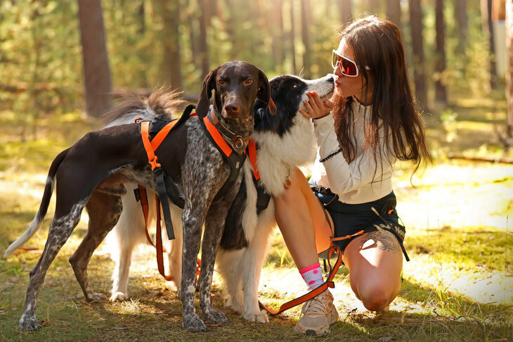 У собак чувствительная шея, поэтому бегать на ошейнике нельзя. Покупаем мягкую шлейку – прогулочную, с подкладом или ездовую, если планируются старты. Также нужен поводок с амортизатором – потяг, чтобы сгладить рывки. А на человеке – пояс, который крепится на тазобедренные суставы. Берите хорошие кроссовки, подходящие под поверхность, а если бегаете по пересеченке, лучше надевать трейловую обувь. Обувь с шипами не подойдет – можно нечаянно наступить на собаку и травмировать ее.