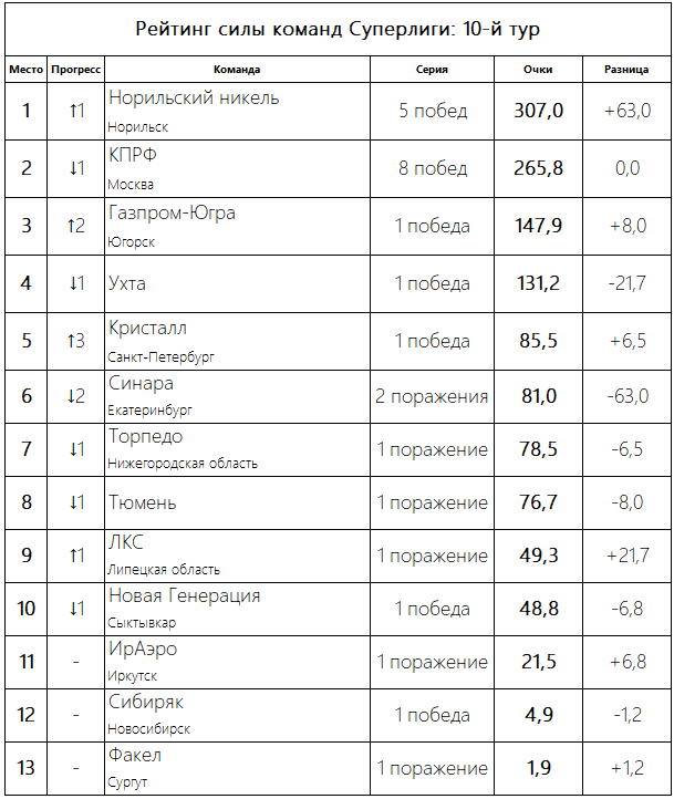 «Норильский никель» возглавил рейтинг силы команд Суперлиги: итоги 10-го тура