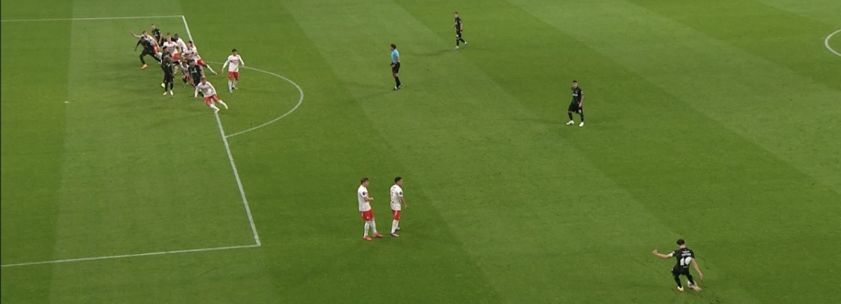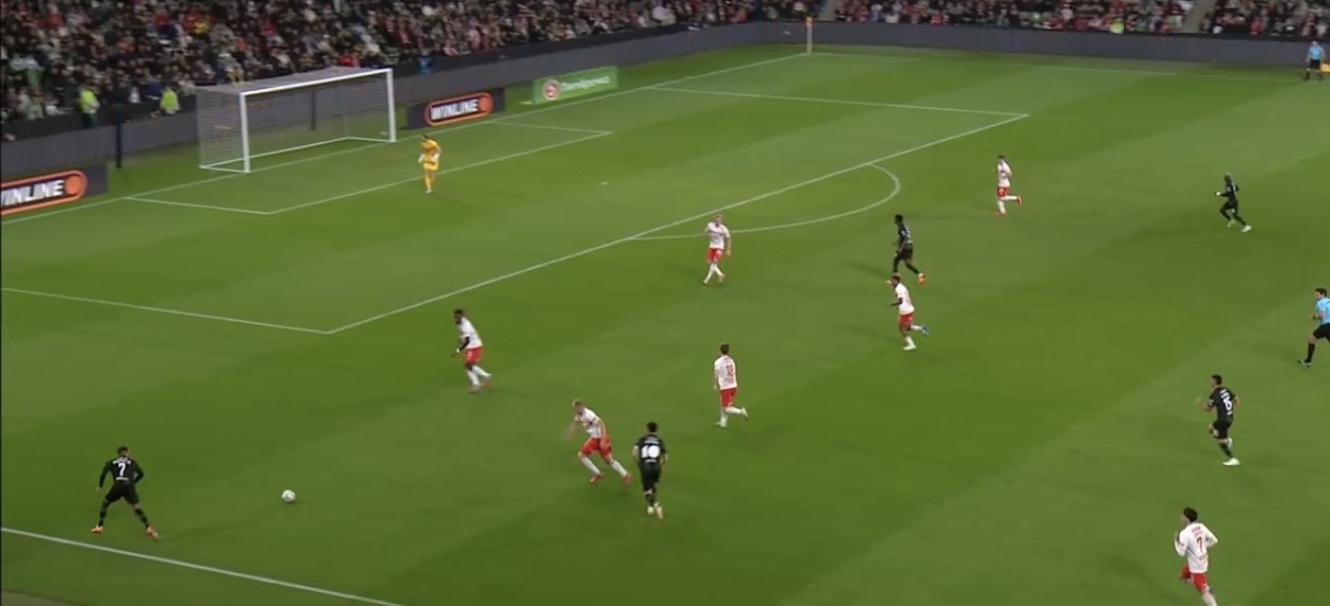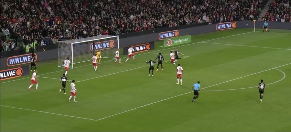 Левый защитник, обратите внимание, влетает в штрафную, попадает в штангу и уже на подборе мяч доходит до Черникова, который остается без опеки. Изначально с ним должен был сыграть Жедсон. Португалец был ближе всех к Александру. Но оборона просто проспала подбор, зачем-то побежала в ворота и пропустила .