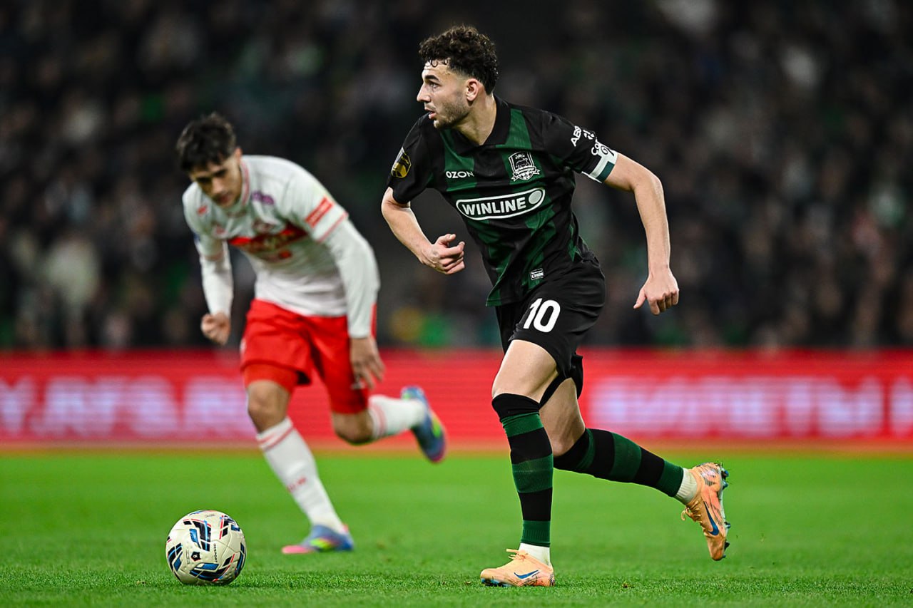 Сперцян уводит за собой игрока, освобождая пространство для Виктора . Бразильский вингер получает свободную зону, обыгрывает и делает навес, который замыкает Оласа.