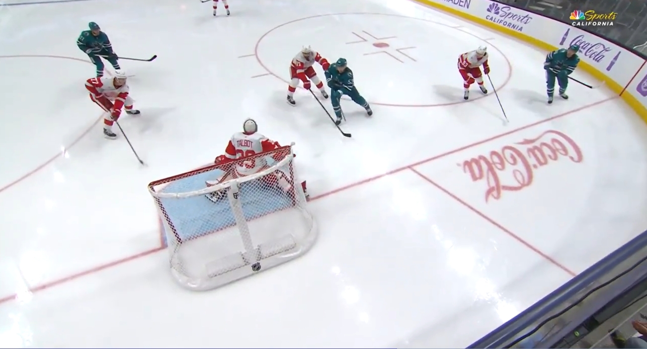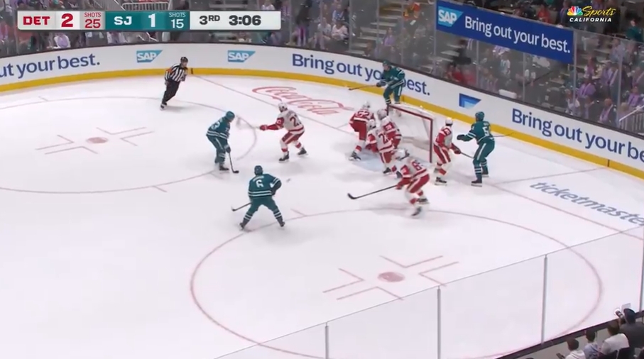 Я также писал про проблемы «Ред Уингс» с удерживанием лидерства – сразу начинается какая-то суматоха и дрожание. Зайдер решил «помять» лицо Селебрини на всякий пожарный, в какой-то степени потушив наш натиск. Это дало момент «Сан-Хосе», которые опять сравняли – первая шайба в НХЛ для Сэма Дикинсона. Не имею представления, как он оказался открыт прямо по центру.