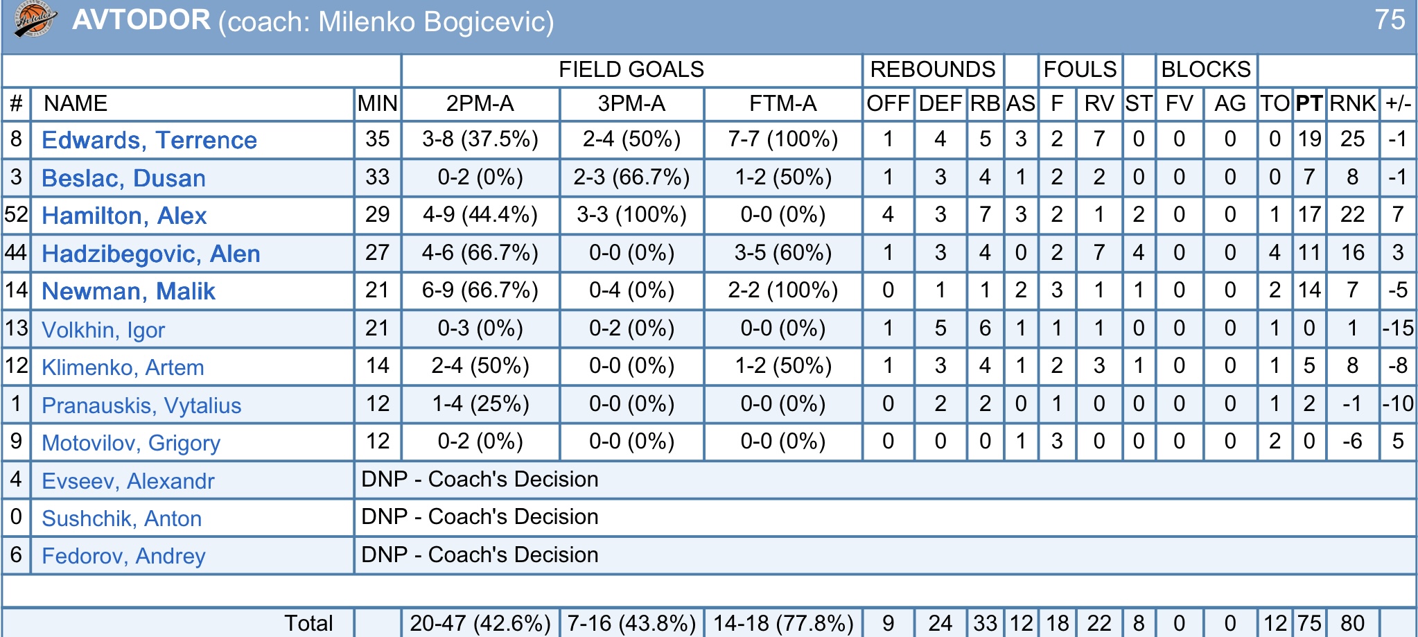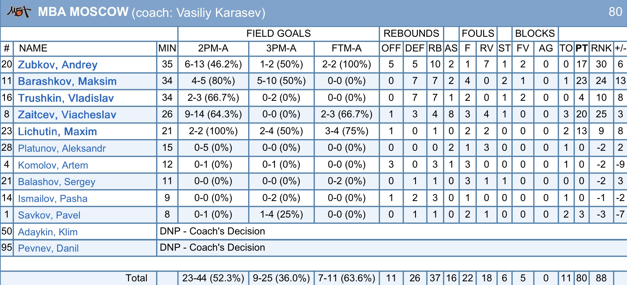 Максим Барашков провел лучшую игру в карьере. На счету форварда 23 очка (4 из 5 – двухочковые, 5 из 10 – трехочковые), 7 подборов, 2 передачи, 2 перехвата и 1 блокшот при 1 потере. Отличную встречу провел Вячеслав Зайцев. Разыгрывающий набрал 20 очков (9 из 14 – двухочковые, 2 из 3 – штрафные), 4 подбора (1 на чужом щите), 8 передач и 1 перехват при 3 потерях.