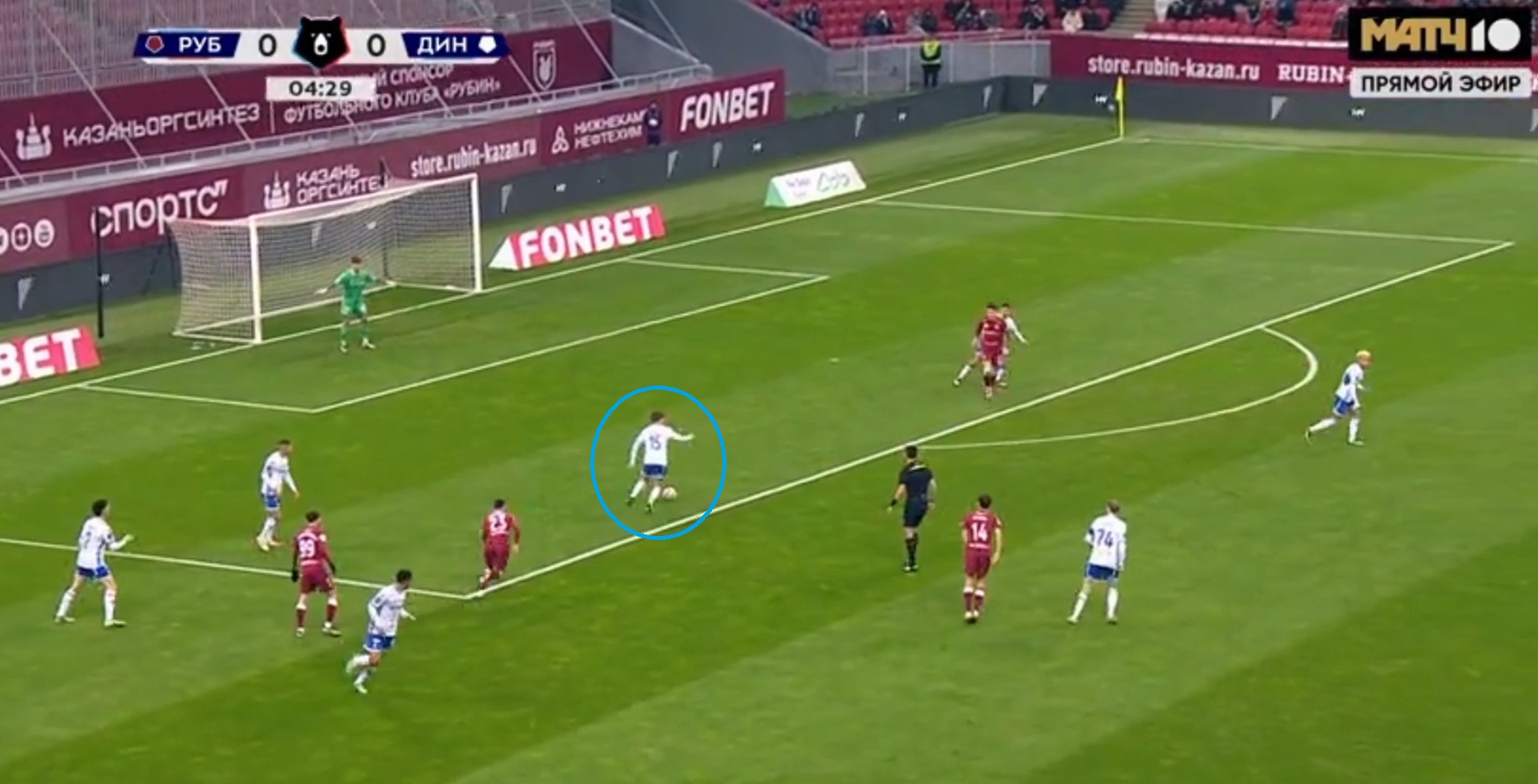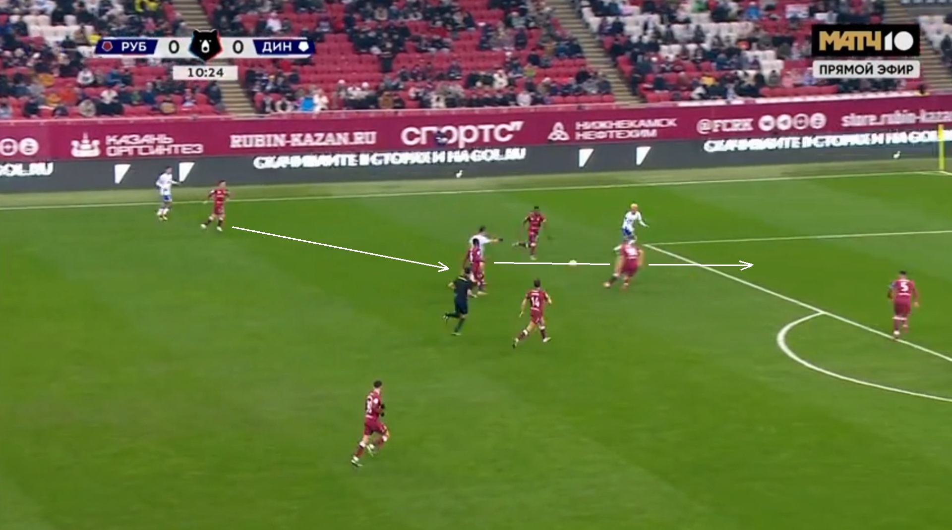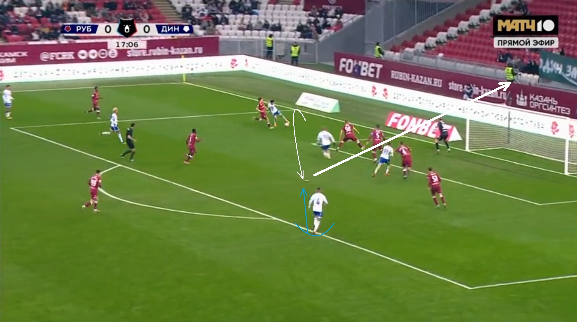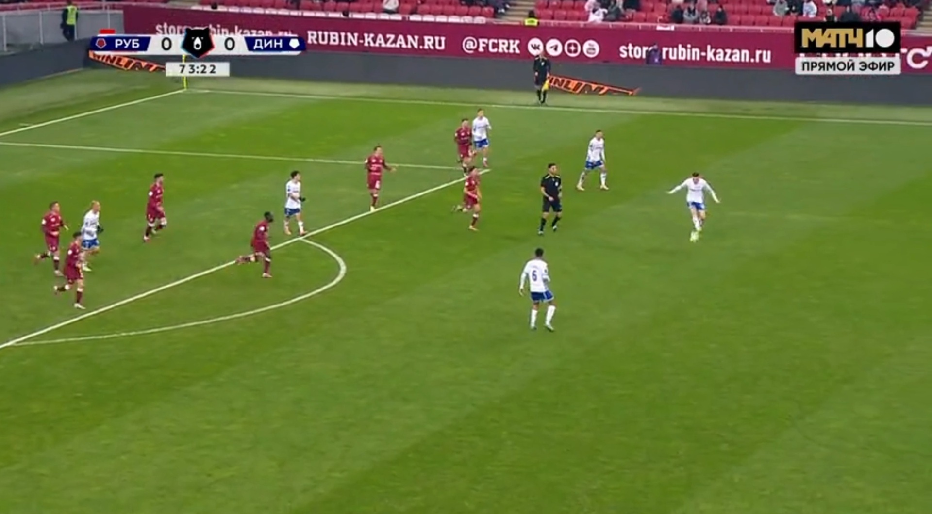 Рубин ответил редкой атакой, но посмотрите, сколько динамовцев вернулось назад. И снова Глебов на позиции центрального защитника. Неизвестно успеет ли набрать кондиции к среде Осипенко, поэтому не могу определить — это установка помогать только паре Маричаль-Фернандес или всегда так играть.