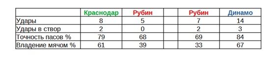 Хозяева поля также провели всего две замены в стартовом составе: вместо серба Йочича вышел армянин Иву, а слева в обороне вместо Грицаенко вернулся капитан Вуячич. В предыдущем туре казанцы проиграли 1:0 в Краснодаре действующему чемпиону. Приведу сравнительную статистику Рубина и Динамо против краснодарской команды в этом сезоне: