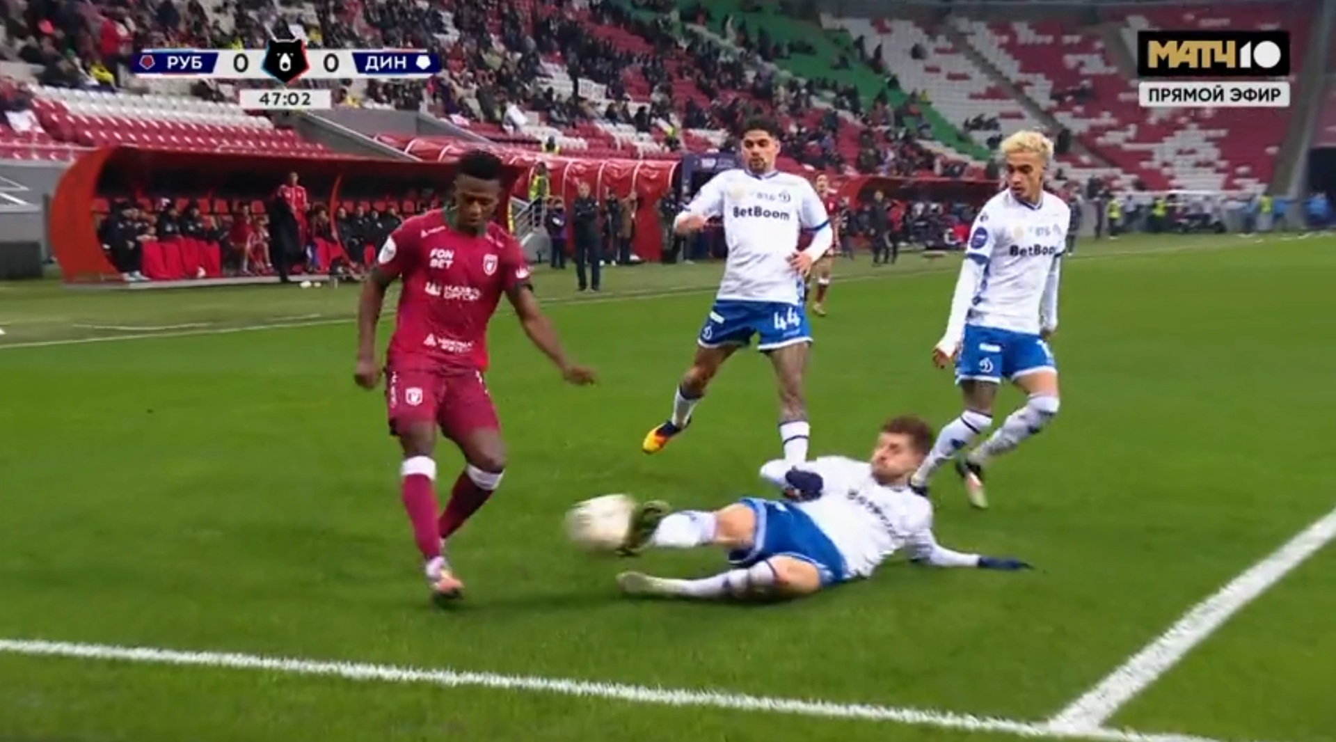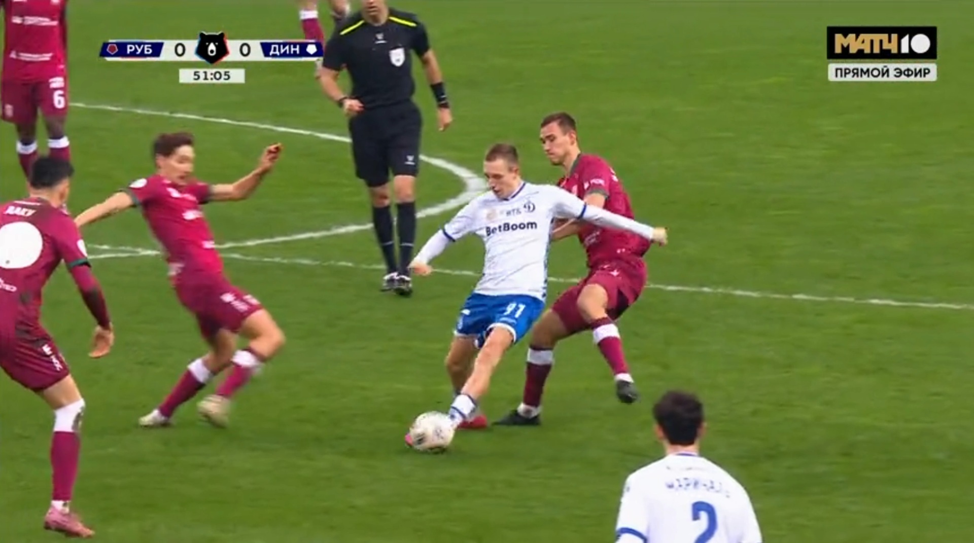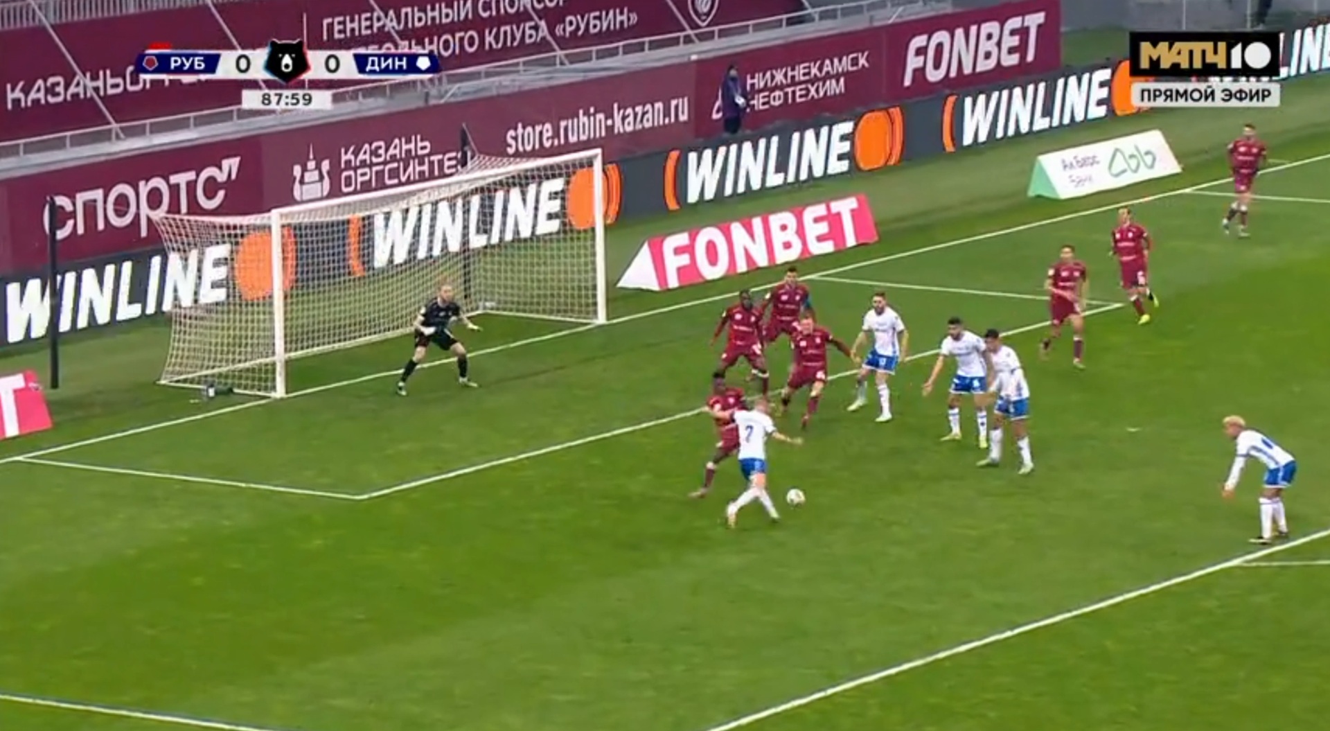 Следующее предупреждение получил Глебов — как раз в моменте, когда он на чужой половине поля заблокировал Даку. Казалось бы, Динамо играет в большинстве, имеет небольшое территориальное преимущество, но вся тактика свелась к навесам, да ещё периодически приходилось догонять контратаки соперника. Интересно, что сказал в перерыве Карпин, что игра команды разительно изменилась и стала очень нервной. Перед своей заменой Костя Тюкавин продемонстрировал хорошую технику в одно касание, продолжив атаку на Бителло, которому снова не хватило точности при навесе в штрафную. Вот только я смотрю на стоп-кадр заключительной части атаки и думаю — а нужно ли было вообще навешивать в этой ситуации?