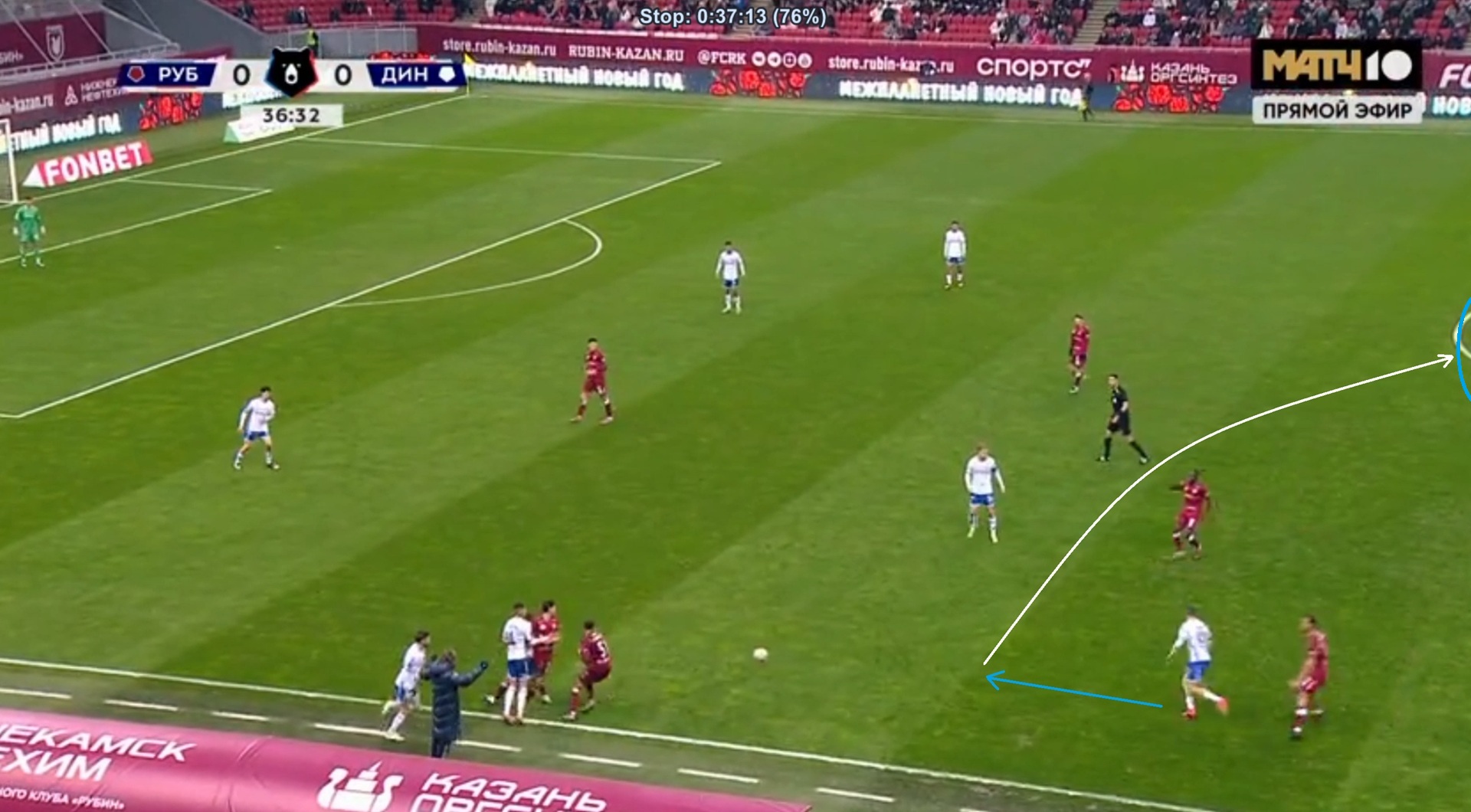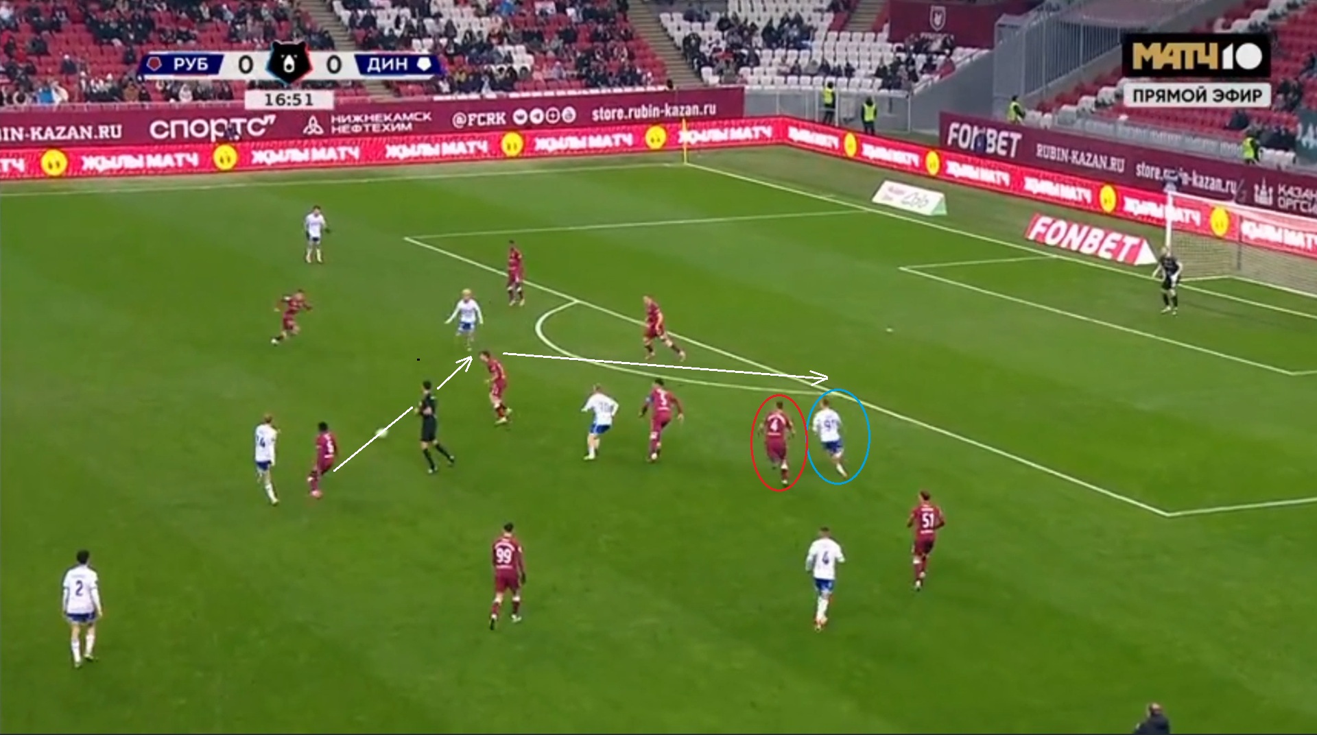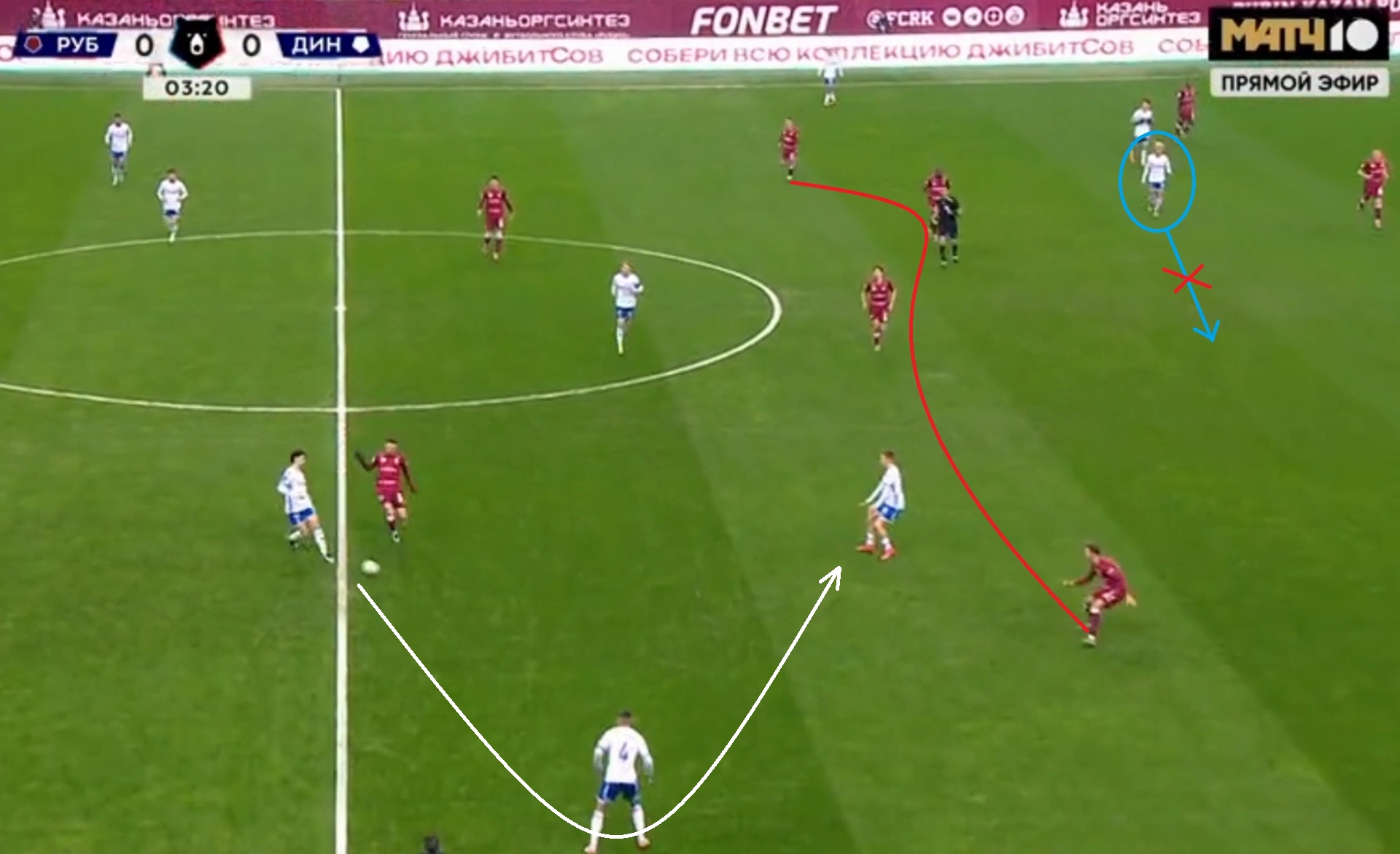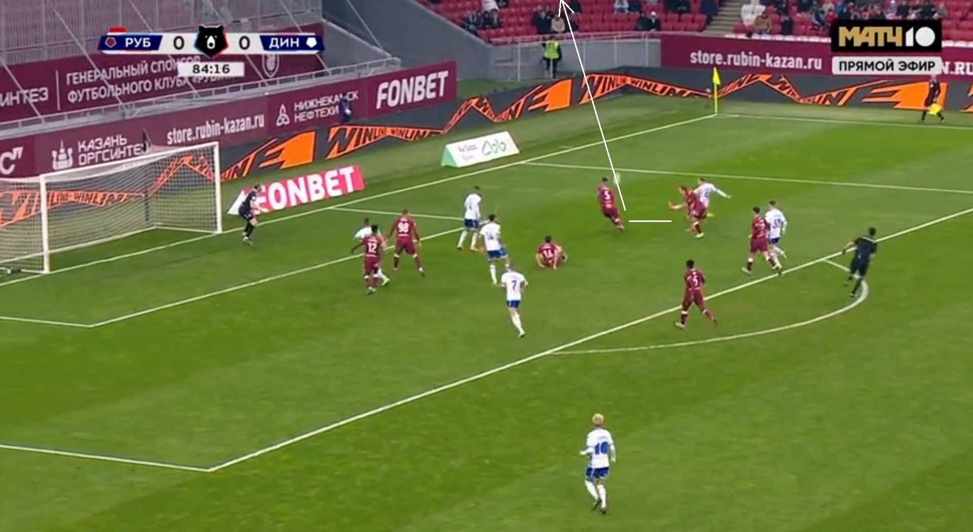 Первая позиционная атака Рубина хорошо демонстрирует расположение наших игроков. Также в этом эпизоде каждый наш игрок своевременно выдвигался на соперника с мячом. Хотя хозяева сыграли в атаке относительно пассивно, тем не менее прогресс в слаженности оборонительных игроков у нас просматривается.