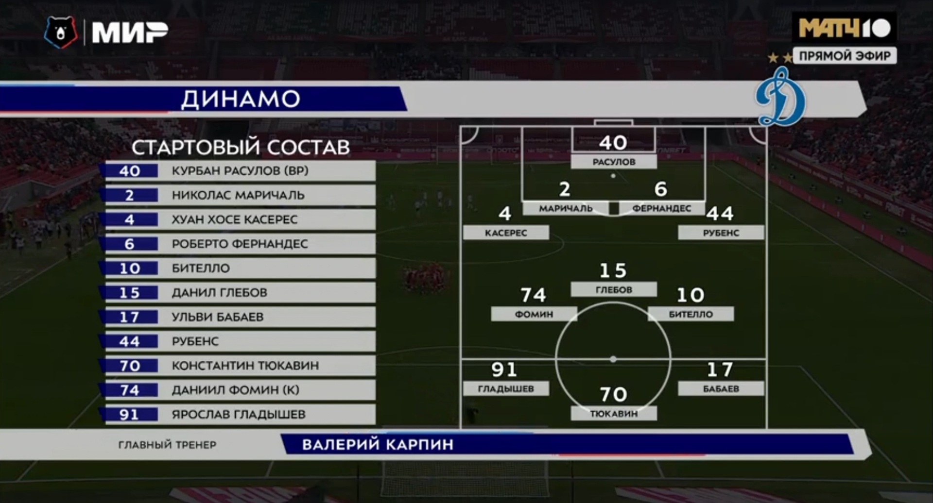 Сразу после удаления Валерий Карпин делает двойную замену — Кутицкий вместо Фомина, Скопинцев вместо Рубенса. Можно было согласиться с комментаторами Матч ТВ, что Карпин хотел дать больше свободы Глебову в центре плюс отправил отдыхать двух игроков перед кубковой встречей, однако на этом стоп-кадре видно, что Кутицкий оказался выше Глебова. Также стоит отметить нетипичную высокую позицию левого защитника Фернандеса.