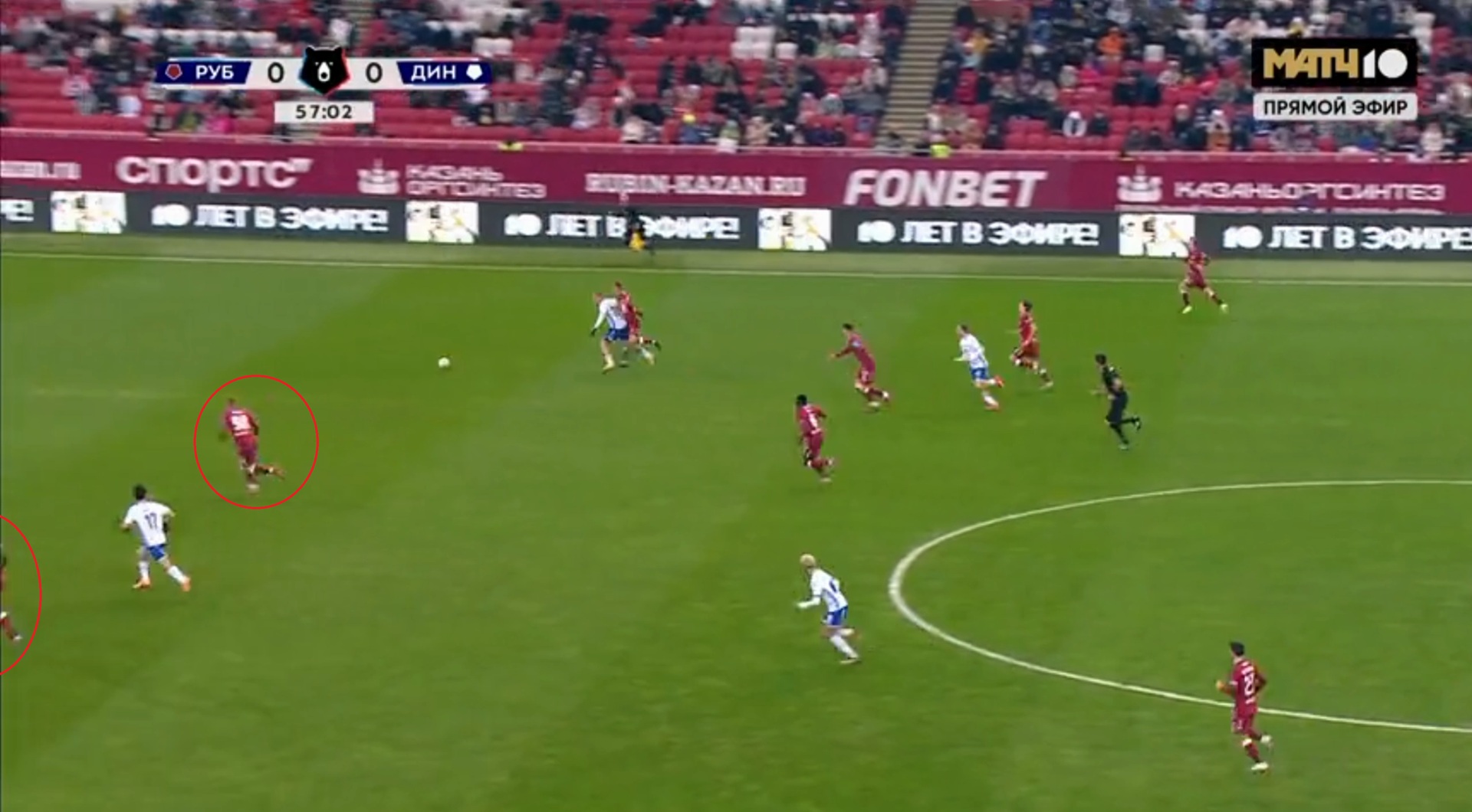 Хотя в дальнейшем владение у команд было одинаковым, всё же было заметно, как казанцы взвинтили темп и заставляли нас чаще ошибаться в простых ситуациях. Потенциально опасный момент был у Иву — только посмотрите, какой провал в середине поля из-за того, что Глебов вновь оказался в центре обороны и не успел подняться выше, что вынудило Фомина остаться так низко…
