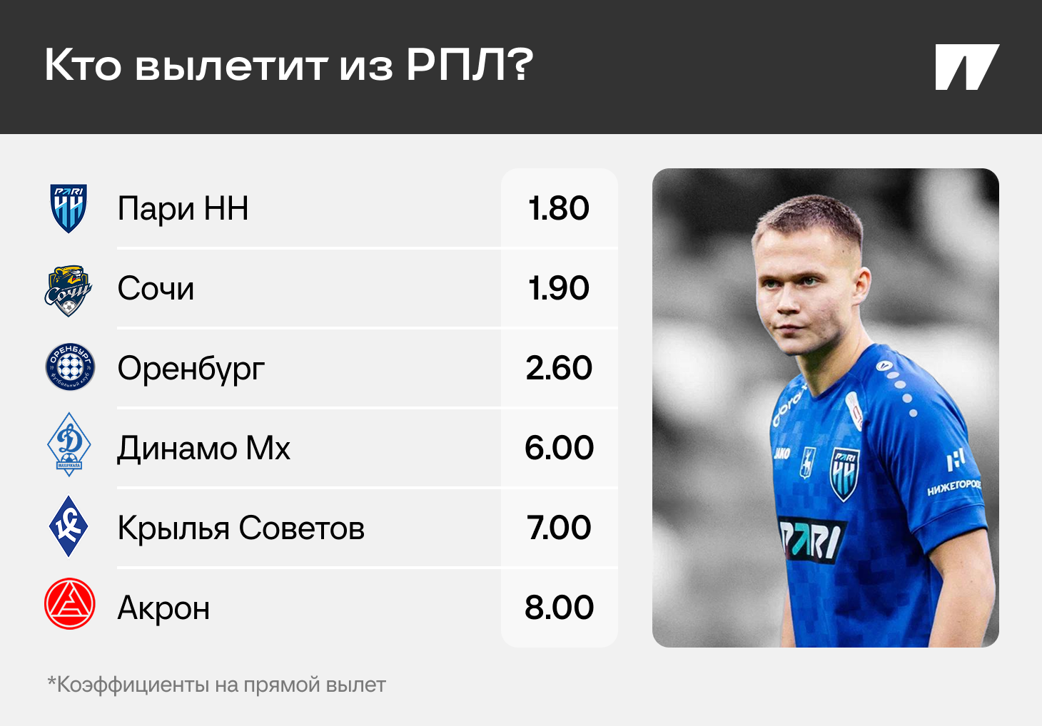 ● «Пари НН», «Сочи» и «Оренбург» – главные претенденты на 15-16 места. «Оренбург» немного ожил после победы над «Сочи» (3:1), но впереди «Локомотив», «Балтика», ЦСКА и «Ахмат».